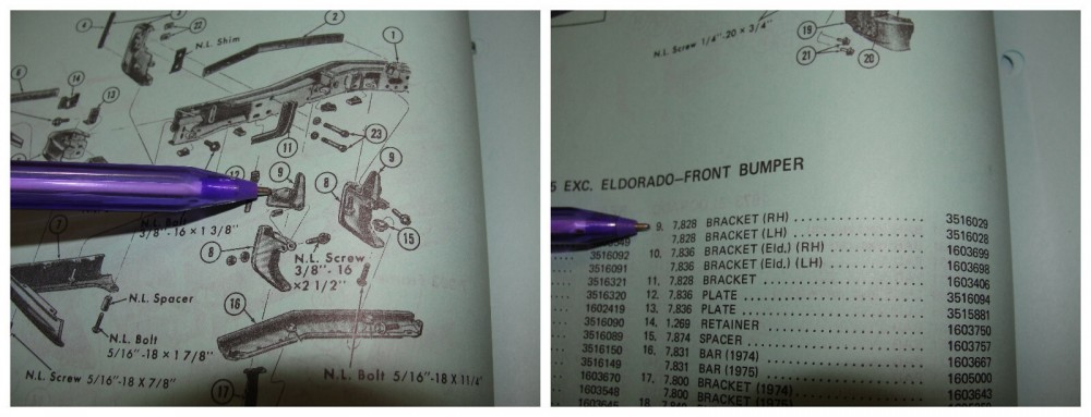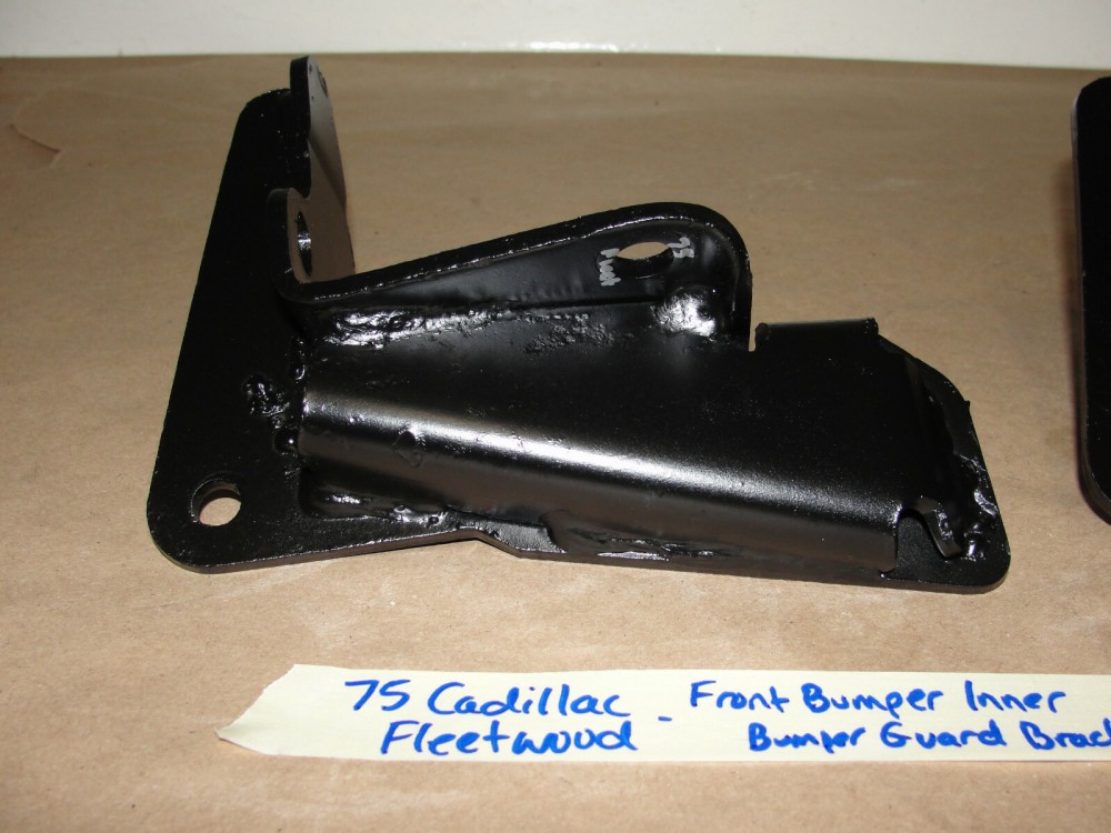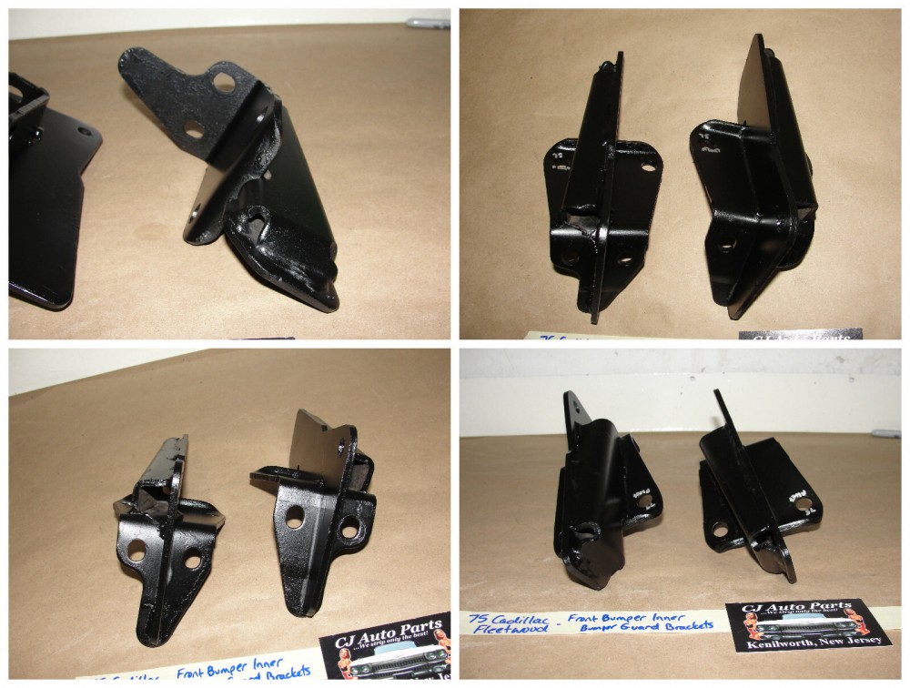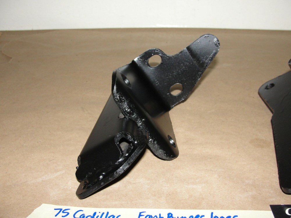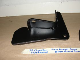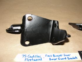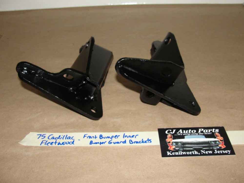 This pair of OEM front bumper inner license plate guard mounting brackets are in very good condition. They are sandblasted and painted. These are the inner brackets that mount to the inner front bumper guards (the smaller ones that surround the front license plate). Brackets are straight and solid, no rot. Please look at all pictures as they are part of the description. This was removed from a 1975 Cadillac Fleetwood, but may fit other vehicles in compatibility chart; fitment is based on Cadillac Master Parts List 7.828, please do your own research as we do not offer refunds if it does not fit your vehicle.