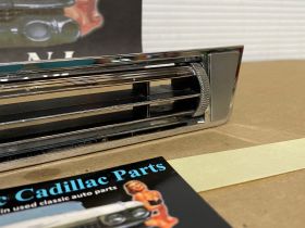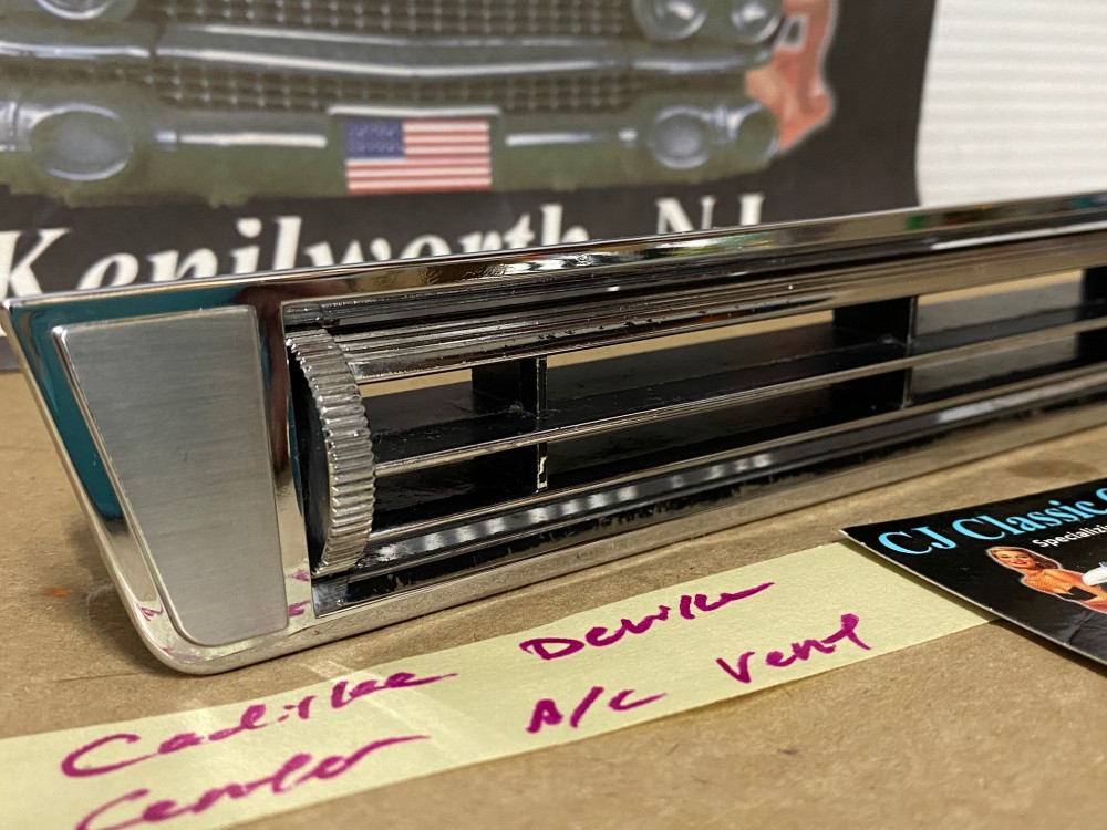 This OEM center dash vent is in very good condition. Chrome has a nice high reflective shine with some minor scratches and pitting typical for its age. Please look at all pictures & compare to yours, as the pictures are part of the description. This was removed from a 1966 Cadillac Deville, but may fit other vehicles listed in compatibility chart; fitment verified by Cadillac Master Parts List 9.262A; please do your own research as we do not offer refunds if it does not fit your vehicle.