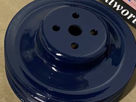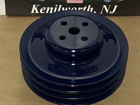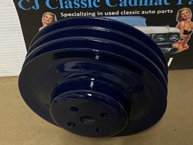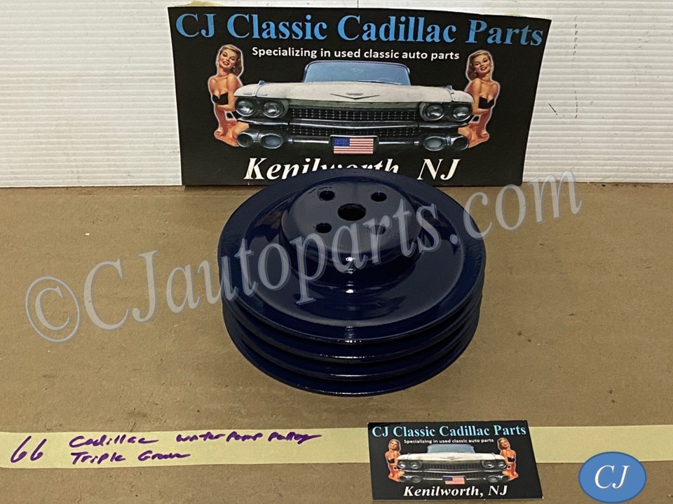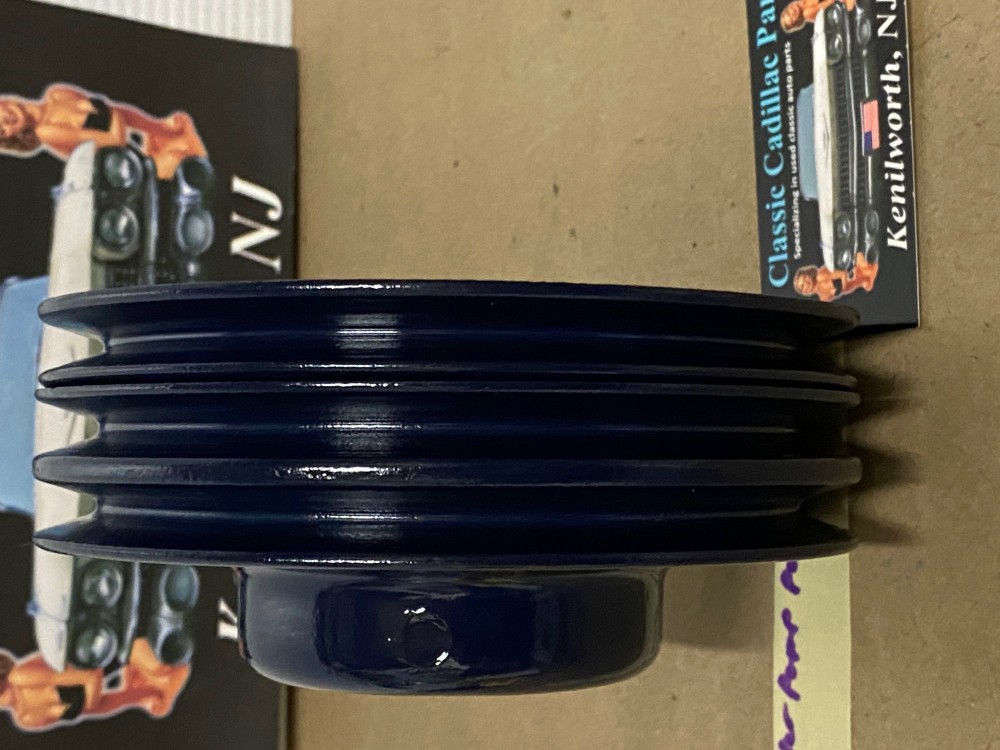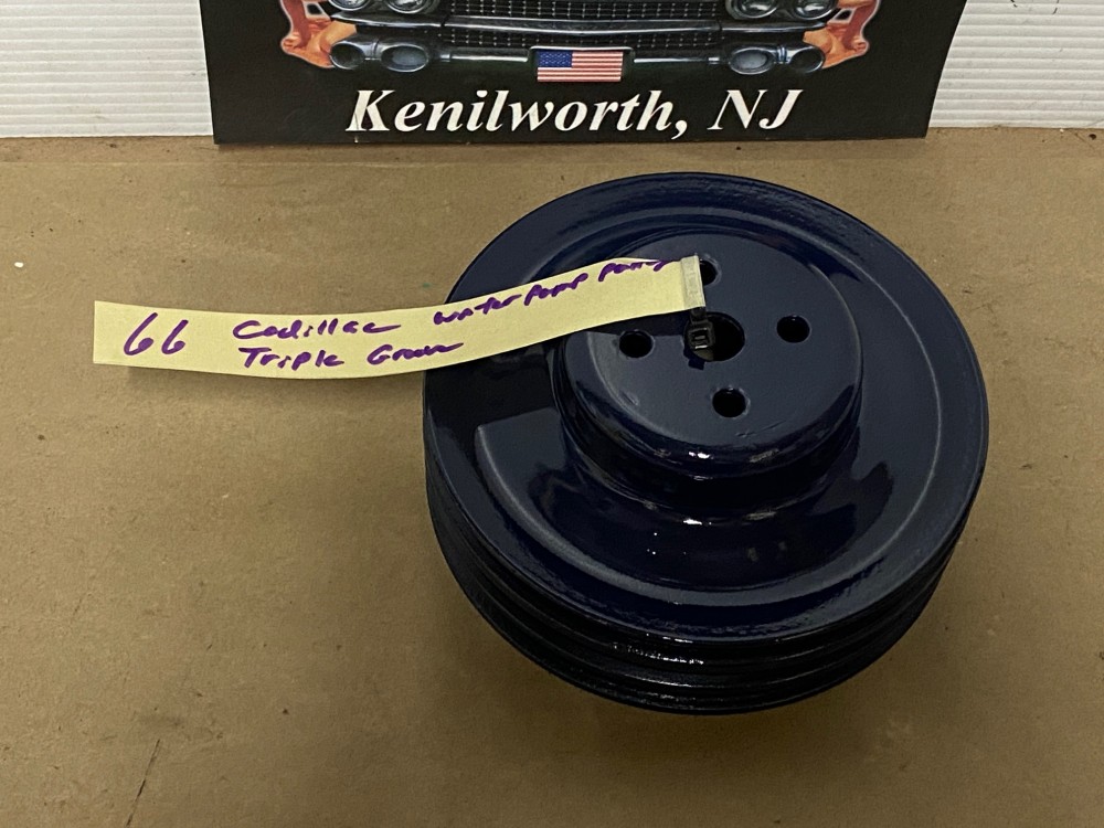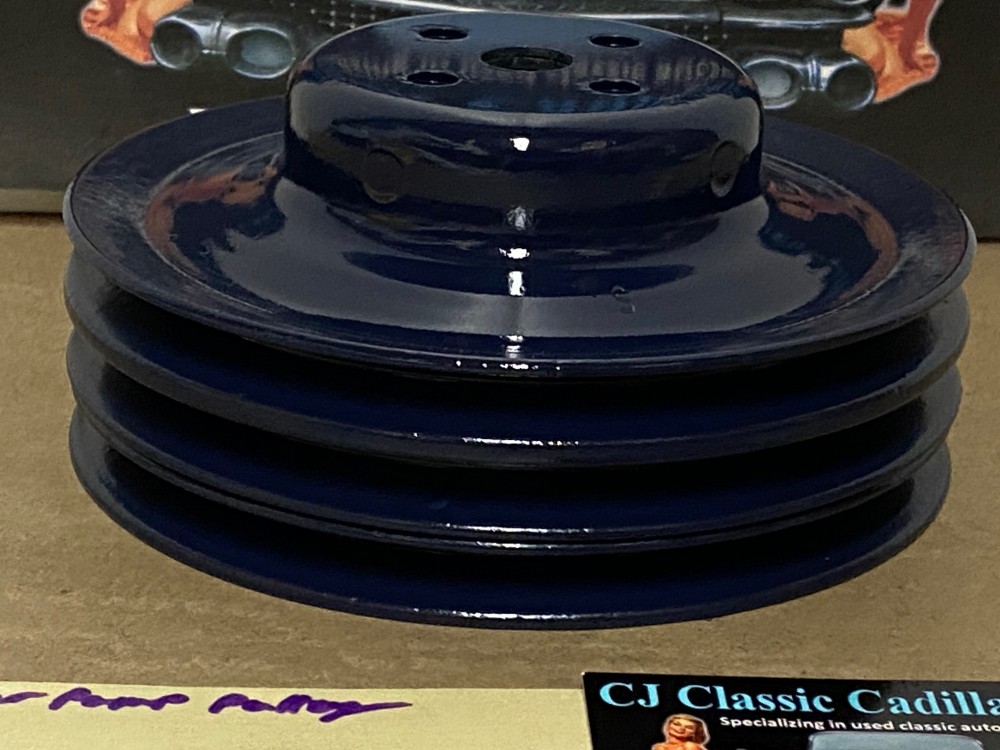 This Restored 3 groove water pump pulley is in very good condition. This was cleaned, sandblasted, and painted with period correct Bill Hirsch engine paint (Cadillac Dark Blue). Has average pitting typical for its age. Please look at all pictures as they are part of the description. This was removed from a 1966 Cadillac Deville, but may fit other vehicles listed in compatibility chart below; fitment is verified by Cadillac Master Parts List 1.062, please do your own research as we do not offer refunds if it does not fit your vehicle. Part#1483552 (Supersedes Part#1469395)