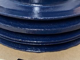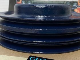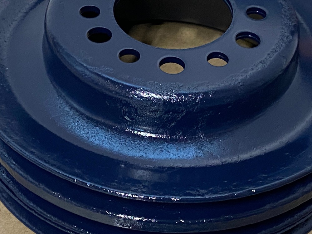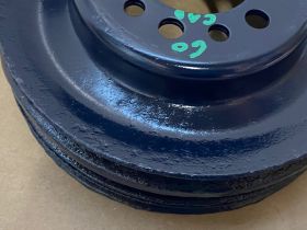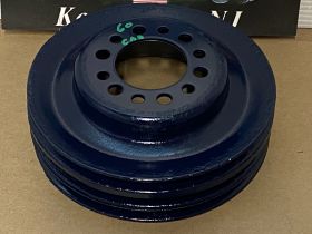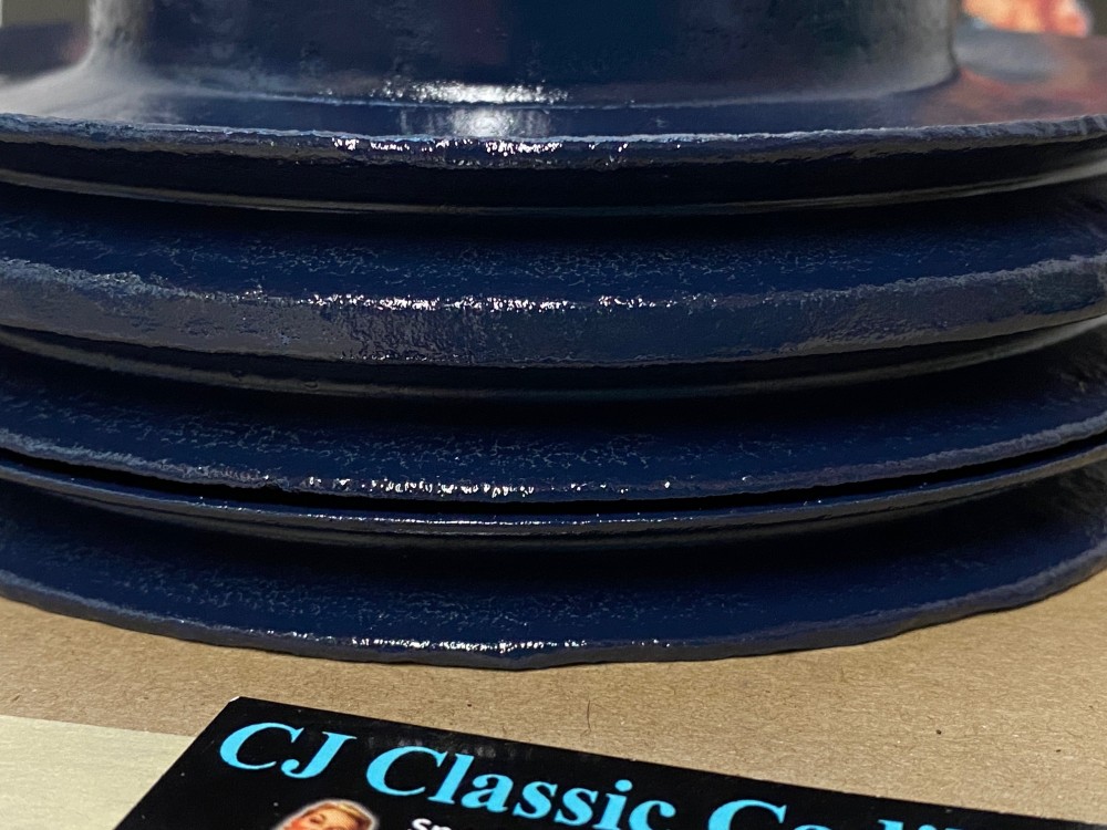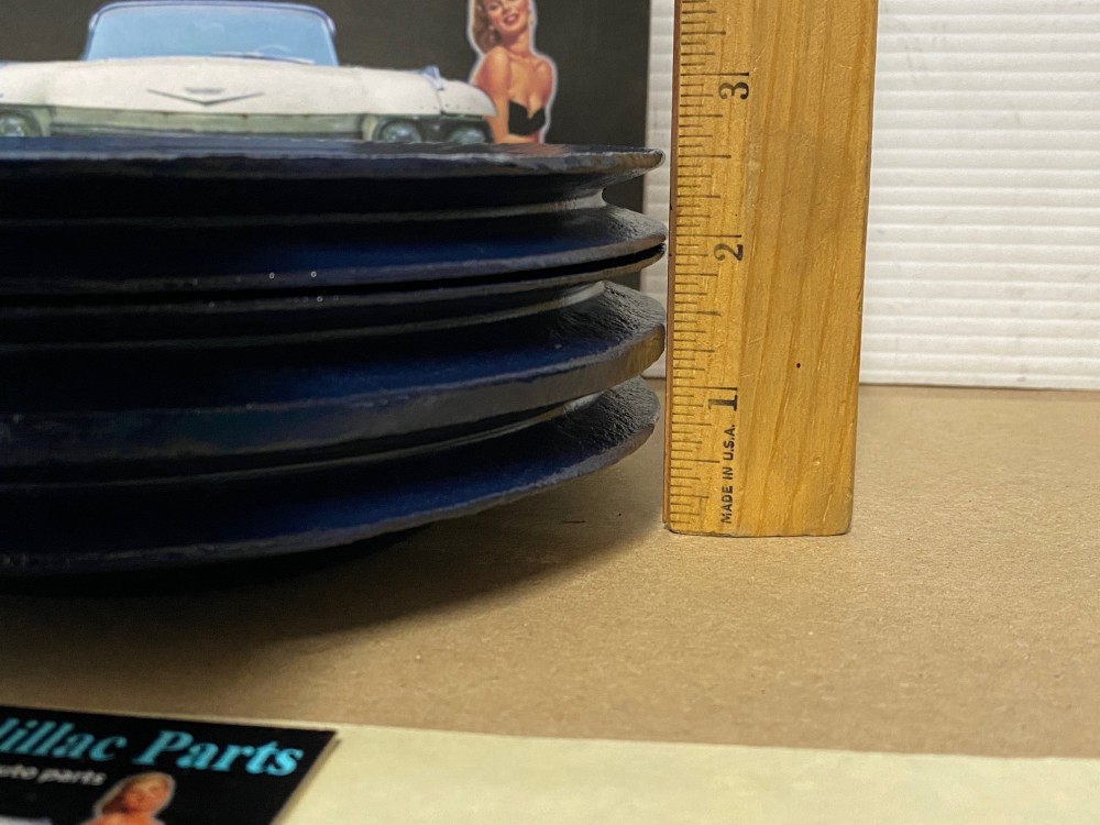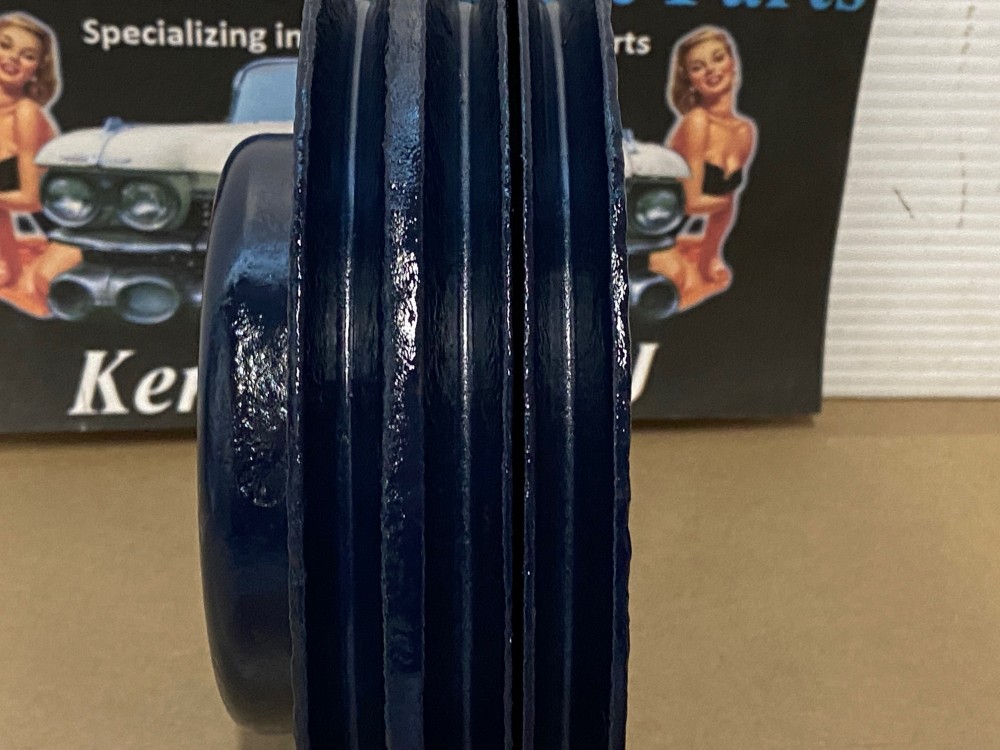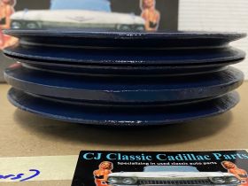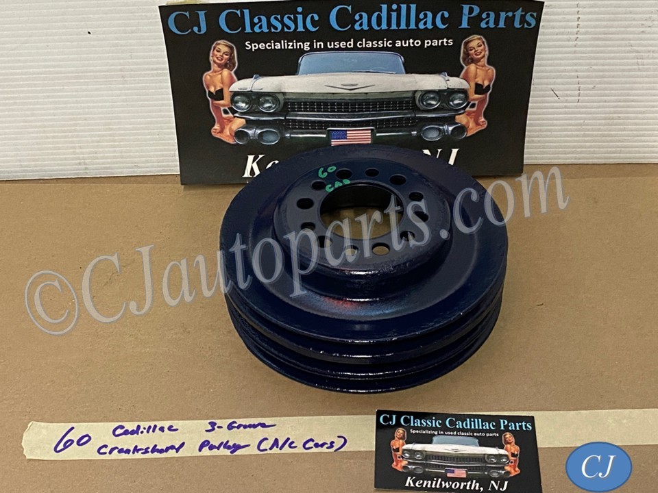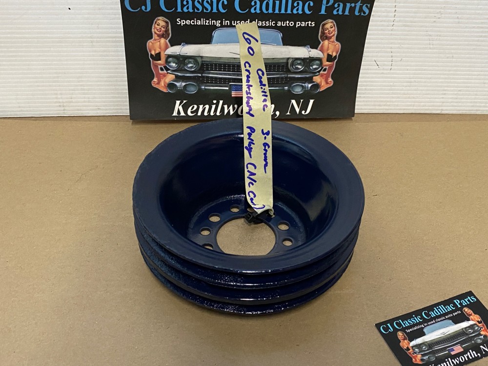 This Restored triple groove crank pulley is in good driver quality condition. This has been sandblasted and painted with Cadillac Dark Blue engine paint. Has a little more than average pitting typical of a used part its age. Pulley is straight. Please view all photos as they are a part of the description.This was removed from a 1960 Cadillac with A/C, but may fit vehicles listed in compatibility chart; fitment is verified by Cadillac Master Parts List 8.0921, please do your own research as we do not offer refunds if it does not fit your vehicle.