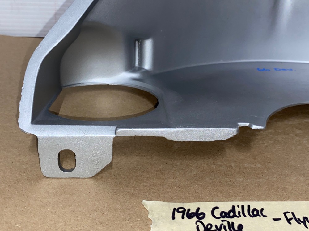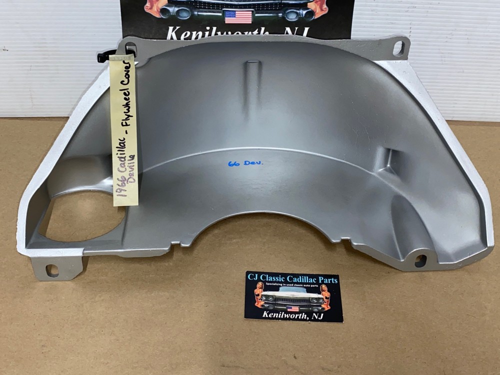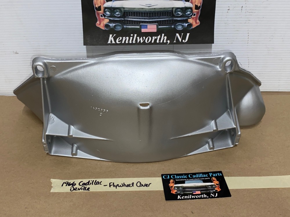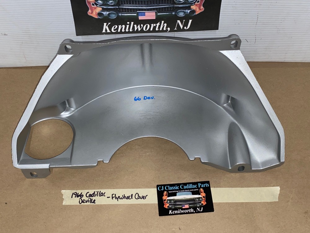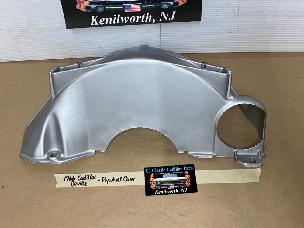 This OEM flywheel inspection plate cover is in excellent condition. Inspection cover is fully intact, no cracks like most out there. These are notorious for cracking around where the starter mounts, this is intact, which is a rare find. This was sandblasted and painted with aluminum blast high heat engine paint. Please view all pictures as they are a part of the description.This was removed from a 1966 Cadillac Deville with 429 engine, but may fit other vehicles listed in compatibility chart below; fitment based on Cadillac Master Parts List 0.679, #1482856; please do your own research as we do not offer refunds if it does not fit your vehicle.