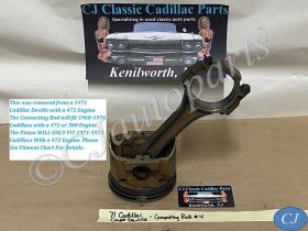 This OEM connecting rod is in very good condition. This listing is for ONE connecting rod as seen in the photos. The piston is included free with the purchase of the connecting rod. It is marked #4 so that you can be sure the one in the photos is the one you will receive. Please view all pictures as they are a part of the description. This was removed from a 1971 Cadillac Coupe Deville with a 472 engine, but may fit other vehicles listed in compatibility chart; Rod fitment is verified by Cadillac Master Parts List #0.603, and Piston fitment is verified by Cadillac Master Parts List #0.629, please do your own research as we do not offer refunds if it does not fit your vehicle.