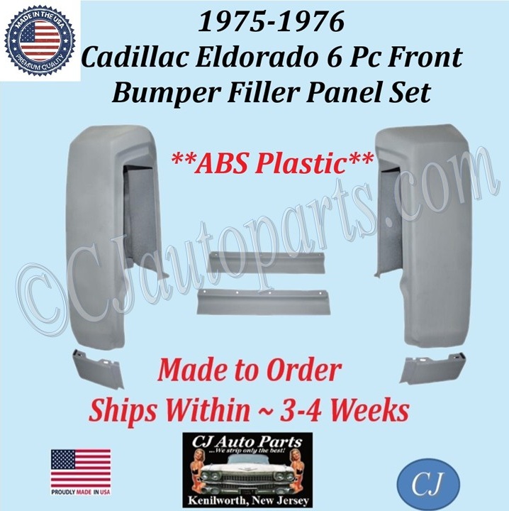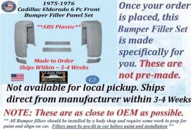 This is a brand new reproduction 6 piece complete front bumper panel filler set MADE IN THE USA from high quality ABS Plastic material. ABS is heat resistant and easy to work with. The fillers come primed and ready to be painted, should be scuffed before painting.