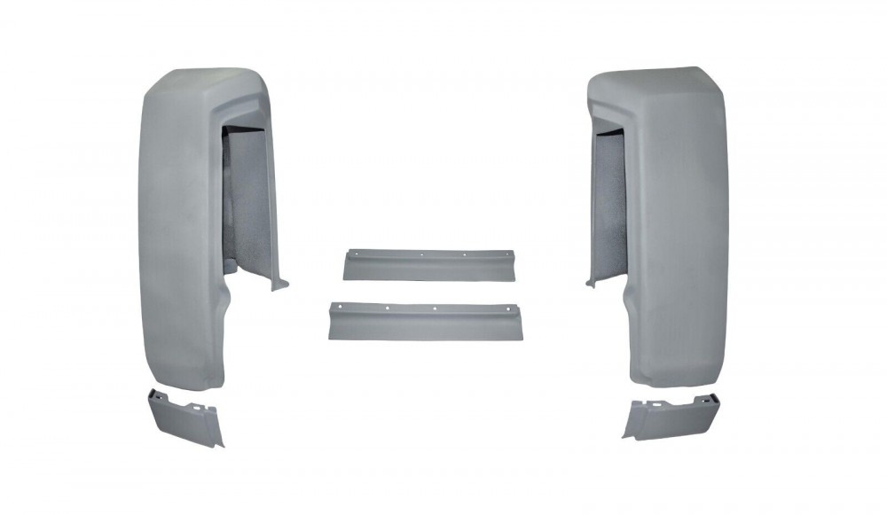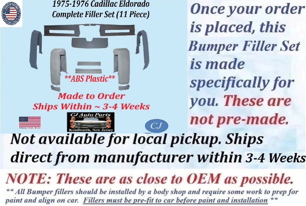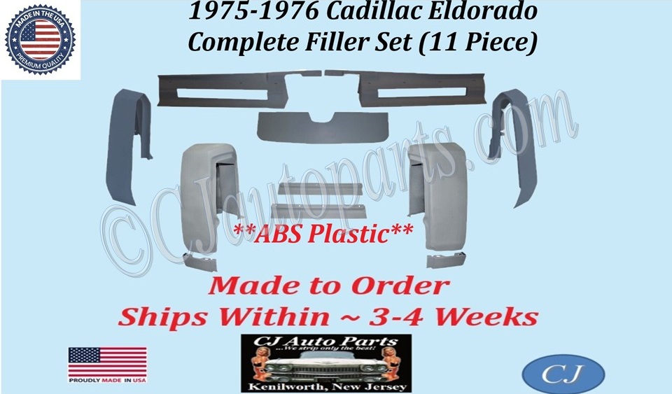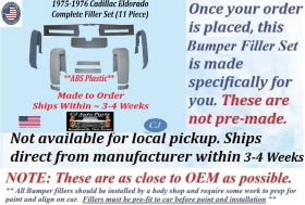 This is a brand new reproduction 11 piece complete bumper panel filler set MADE IN THE USA from high quality ABS Plastic material. ABS is heat resistant and easy to work with. The fillers come primed and ready to be painted, should be scuffed before painting.