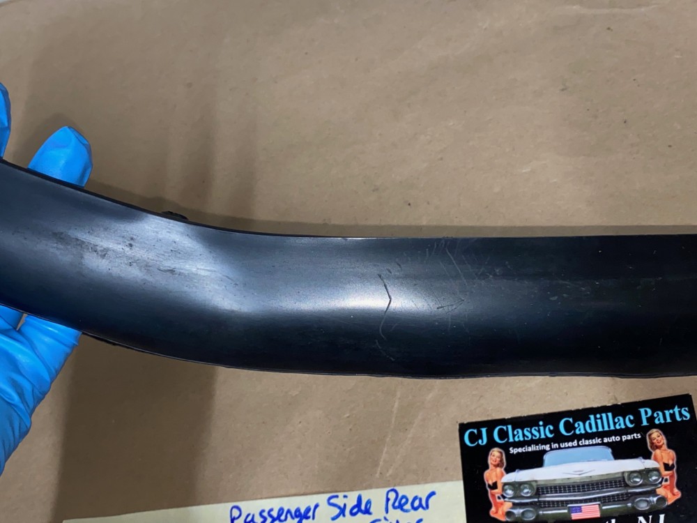 This passenger side rubber quarter panel to rear bumper end filler is in very good condition. Rubber is still nice and pliable, not dry rotted. All mounting holes are intact. Has a couple of minor scuffs and scratches but overall very nice. This mounts between the passenger side rear bumper end and the quarter panel. Please look at all pictures as they are part of the description. This was removed from a 1964 Cadillac, but may fit other vehicles in the compatibility chart; fitment verified by Cadillac Master Parts List 7.833. Please do your own research as we do not offer refunds if it does not fit your vehicle.