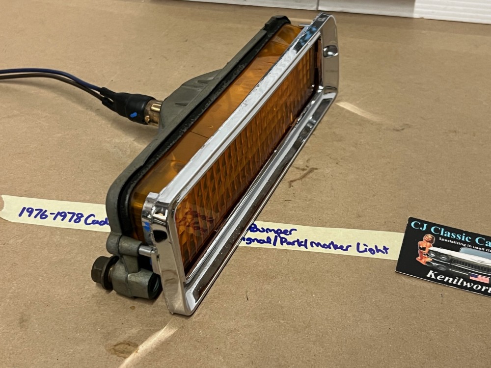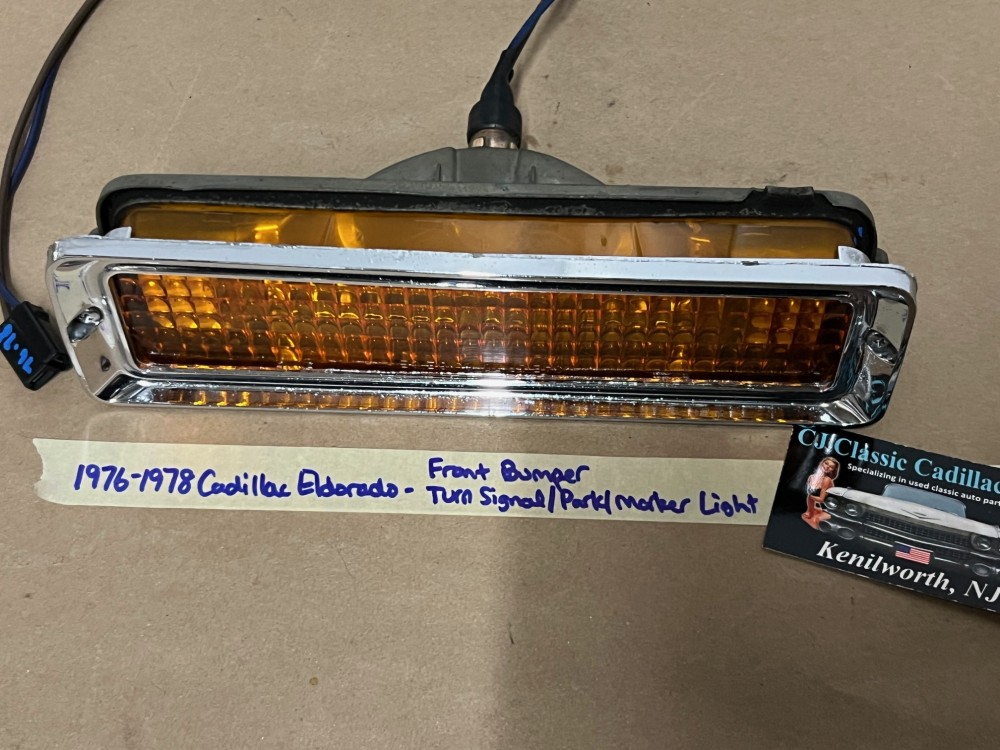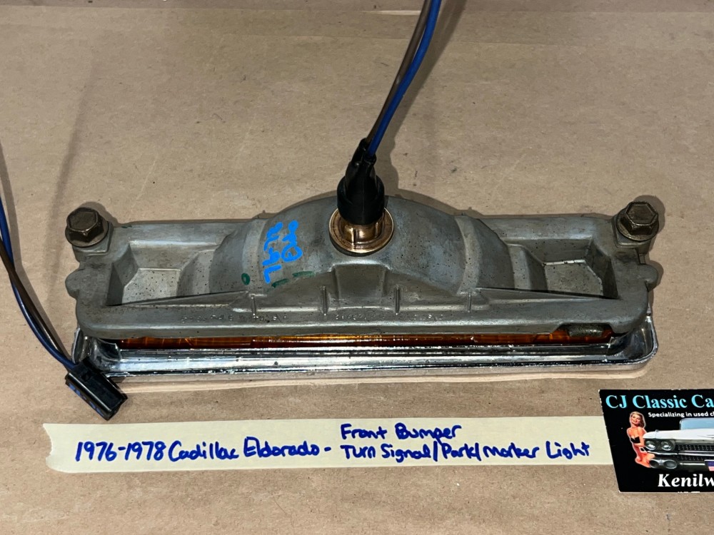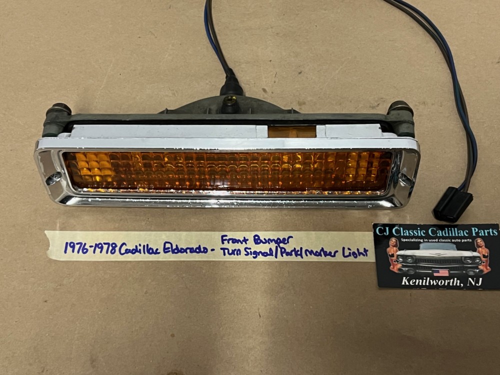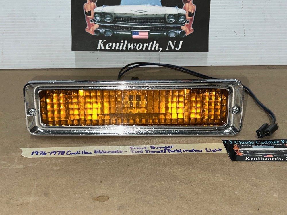 This OEM front bumper turn light is in good working condition (see video) and comes with a new bulb already installed. Ready to plug and play. All contacts have been cleaned and dielectric grease added to bulb socket. Lens is intact, no cracks and is still nice and vibrant orange. The chrome bezel has a nice reflective shine, but does have pitting typical for its age. Please look at all pictures, as they are part of the description. This was removed from a 1977 Cadillac Eldorado, but may fit other vehicles listed in compatibility chart; fitment verified by Hollander Interchange, but please do your own research as we do not offer refunds if it does not fit your vehicle. Please view the video (https://youtu.be/9cXCx-e7rSU ) and look at all pics.