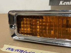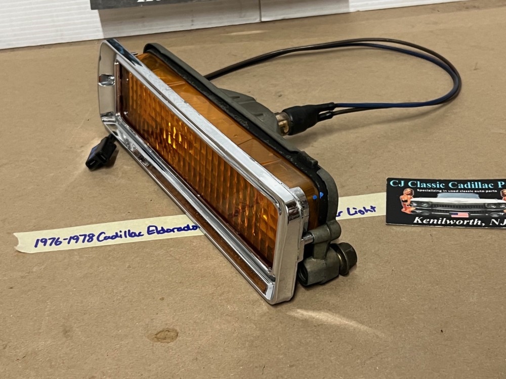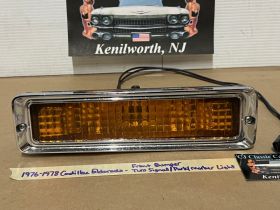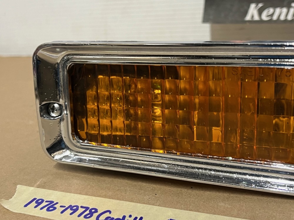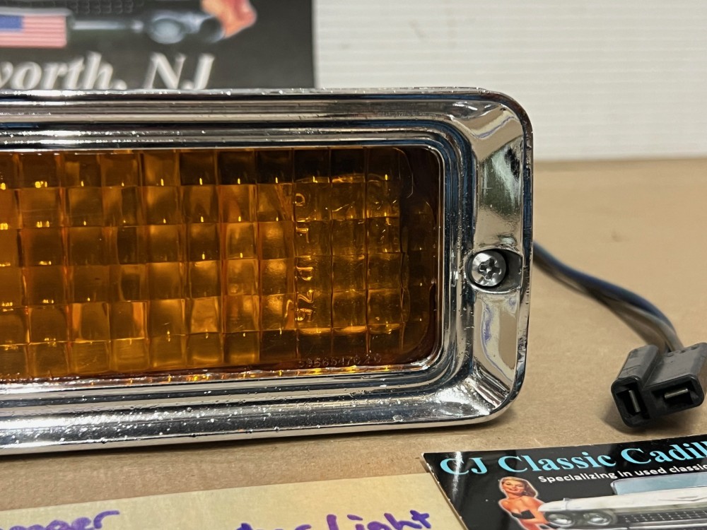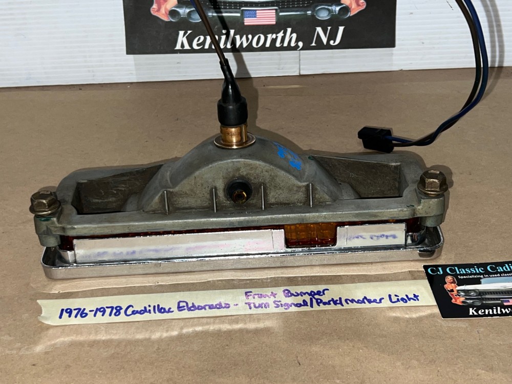 This OEM front bumper turn light is in good working condition (see video) and comes with a new bulb already installed. Ready to plug and play. All contacts have been cleaned and dielectric grease added to bulb socket. Lens is intact, no cracks and is still nice and vibrant orange. The chrome bezel has a nice reflective shine, but does have pitting typical for its age. Please look at all pictures, as they are part of the description. This was removed from a 1977 Cadillac Eldorado, but may fit other vehicles listed in compatibility chart; fitment verified by Hollander Interchange, but please do your own research as we do not offer refunds if it does not fit your vehicle. Please view the video (https://youtu.be/9cXCx-e7rSU ) and look at all pics.