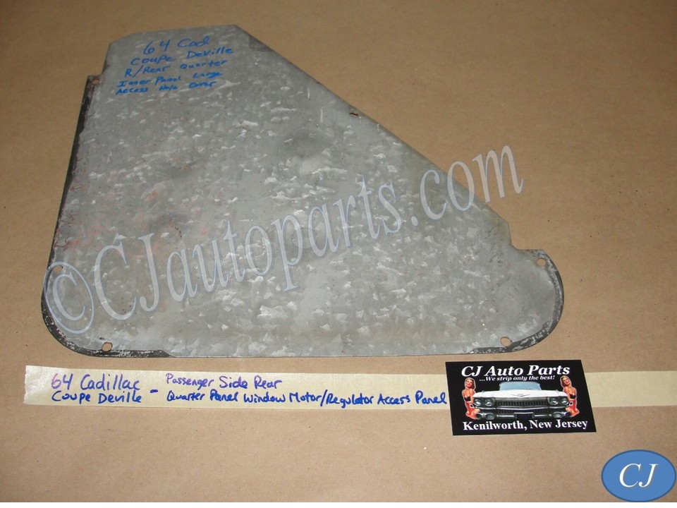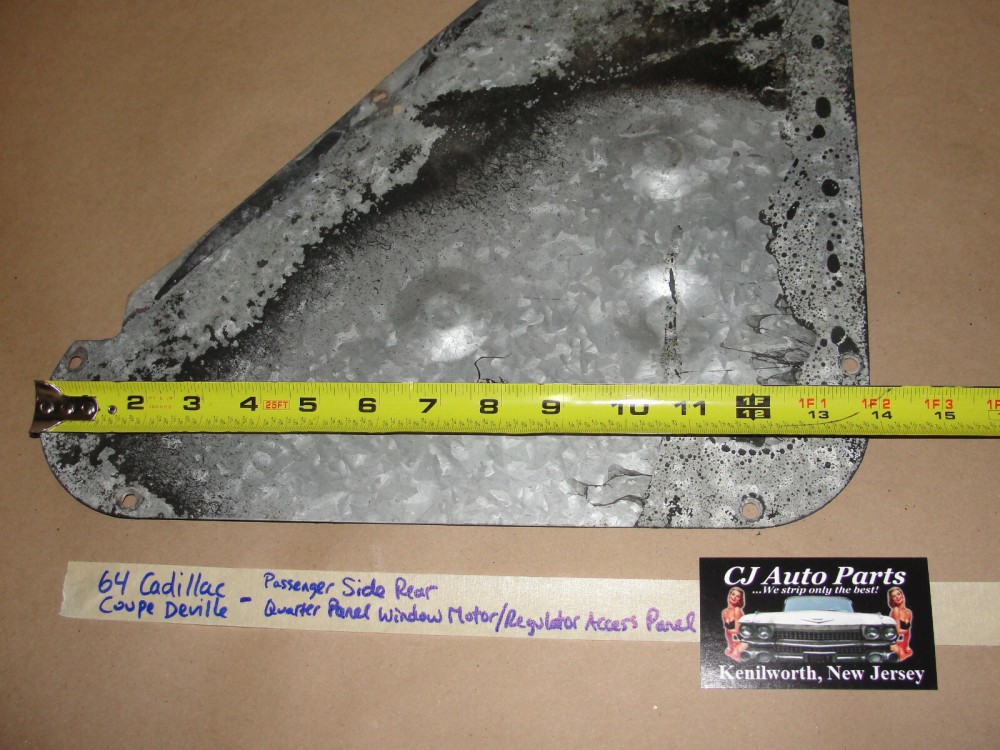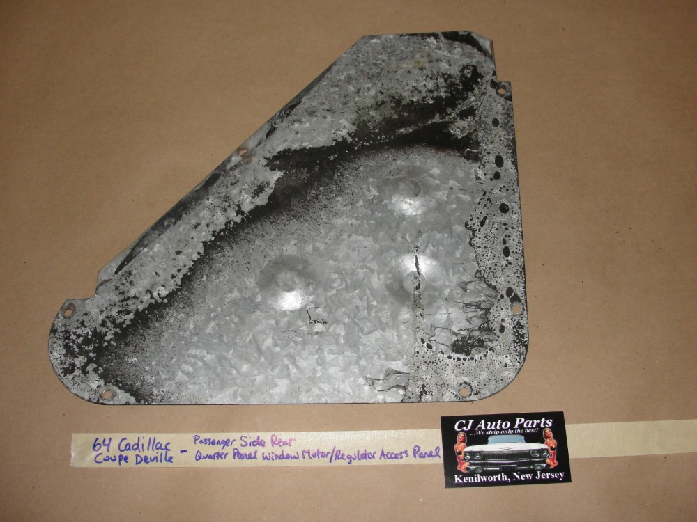 This OEM passenger side rear quarter inner panel window regulator access panel is in very good condition. All mounting holes are intact and no rust. This is the removable access plate to allow access to the rear quarter window motor/regulator. Please look at all pictures & compare to yours, as the pictures are part of the description. This was removed from a 1964 Cadillac Coupe Deville, but may fit other vehicles listed in compatibility chart; please do your own research as we do not offer refunds if it does not fit your vehicle.