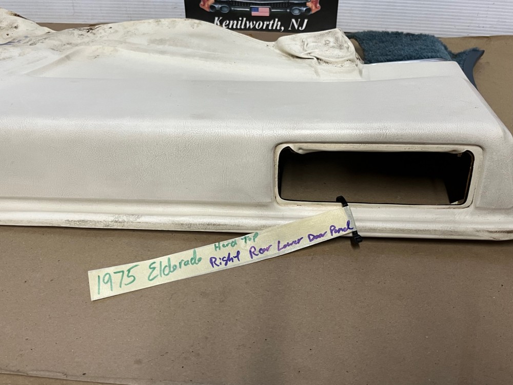 This OEM passenger side rear lower quarter door panel is in excellent condition. The vinyl is intact, no cracks. Has some fading/discoloration typical of a used part its age, but could always be repainted or use as-is, still looks very nice. The cardboard backer is solid. Chrome trim is excellent and carpeted section is also very nice condition. The panel overall is in very nice shape for a used part with some average light wear.  Please look at all pictures as they are part of the description.  This was removed from a 75 Cadillac Eldorado HardTop (will not fit convertible), but may fit other vehicles in the fitment chart. Please do your own research in regards to fitment, as we do not offer refunds if it does not fit your vehicle.