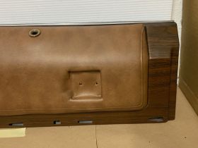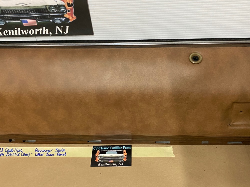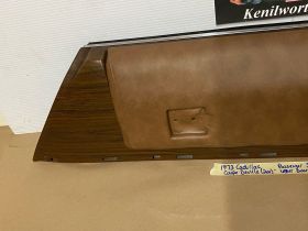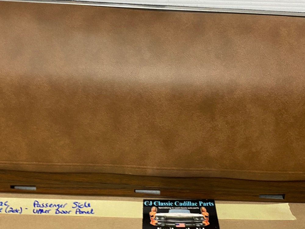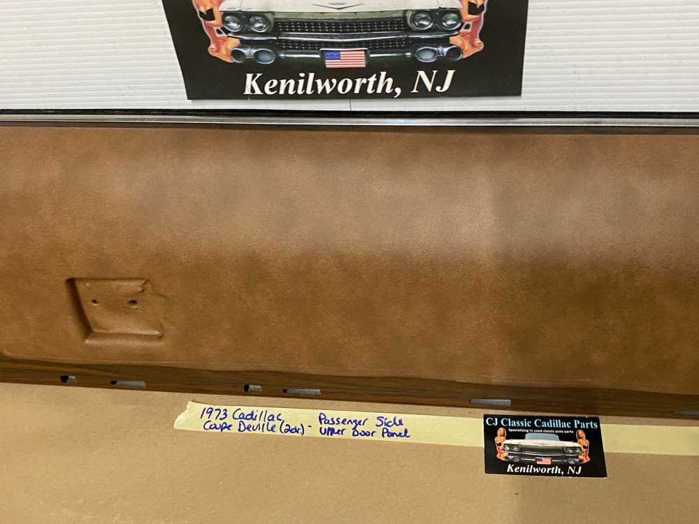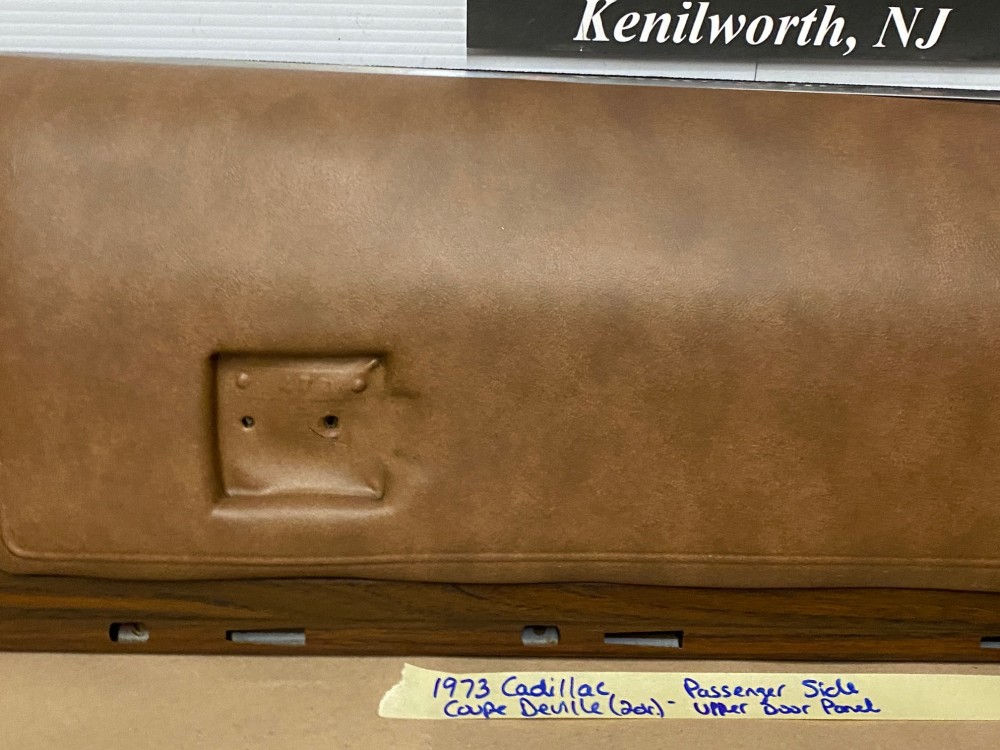 This OEM passenger side front upper door panel is in very good condition. The vinyl is still nice and pliable, not dry rotted or brittle. There are two small cracks, one is at the top edge and the other is near where the pull strap mounts, overall very minor. Woodgrain is still nice and vibrant, not all sun damaged like most get. The felt where the window rides is still in nice shape. Has a some light surface rust on the backside, but obviously not seen and does not affect the door panel itself. Fits 2 door only. Please look at all pictures as they are part of the description. This was removed from a 1973 Cadillac Coupe Deville, but may fit vehicles listed in compatibility chart; please do your own research as we do not offer refunds if it does not fit your vehicle.