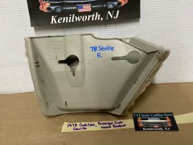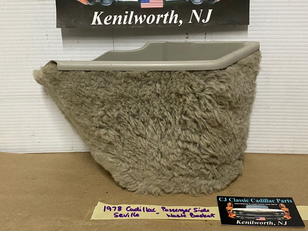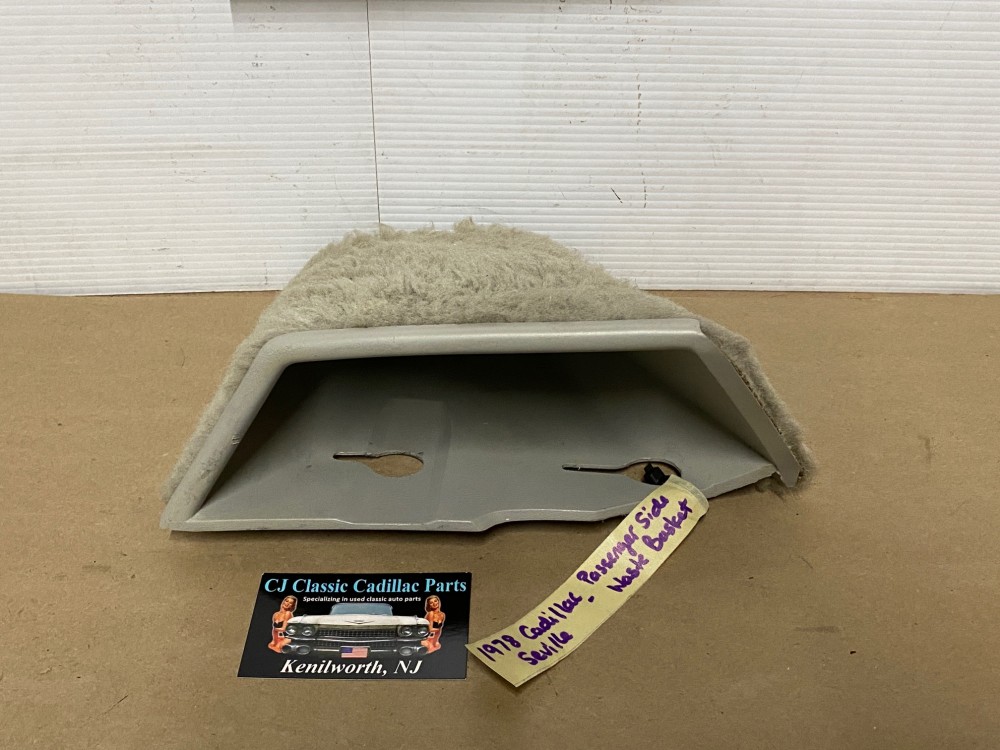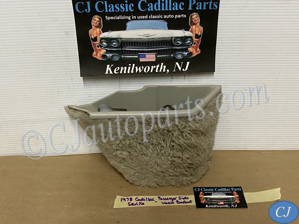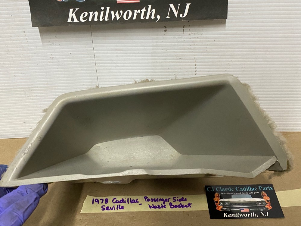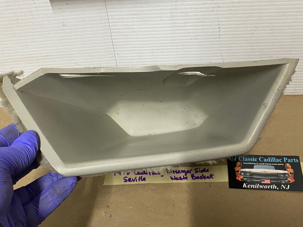 This OEM right side kick panel waste basket is in good condition. Carpet is in good condition, has a little discoloration. No cracks. Overall average wear. Mounting holes are intact. Inside of basket is fairly clean. Please view all pictures as they are part of the description. This was removed from a 1984 Cadillac Fleetwood RWD, but may fit other vehicles listed in compatibility chart; please do your own research as we do not offer refunds if it does not fit your vehicle.