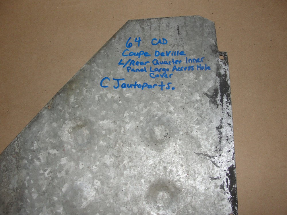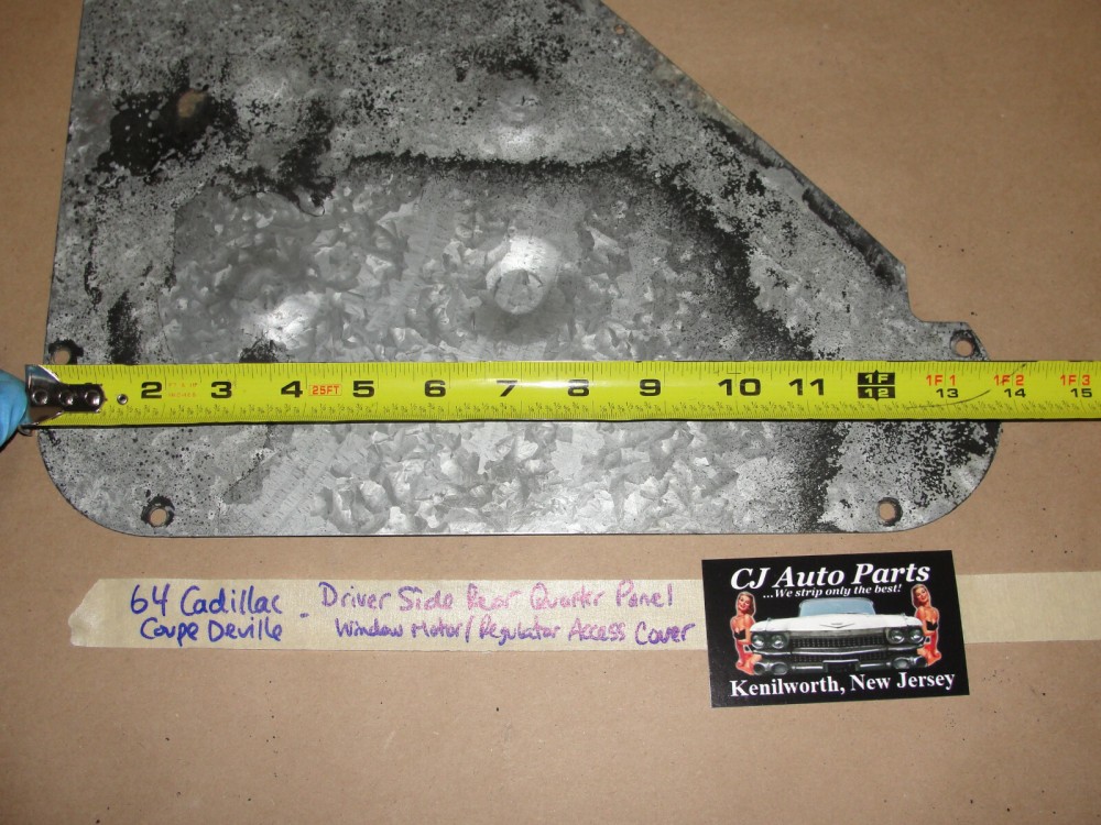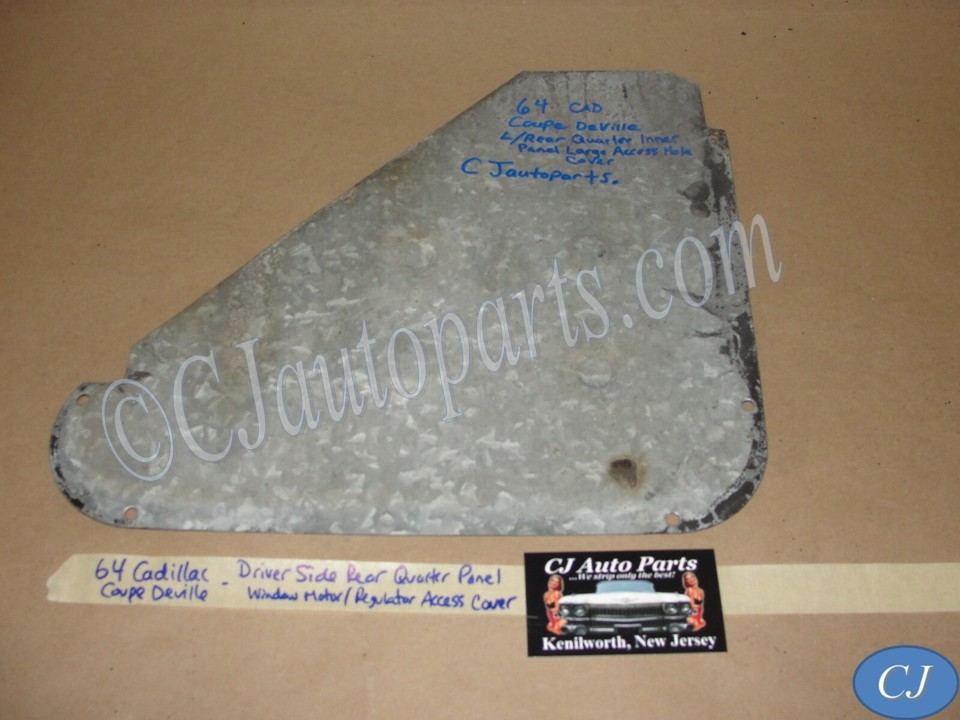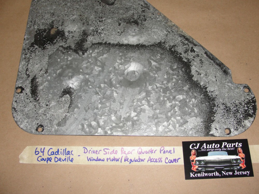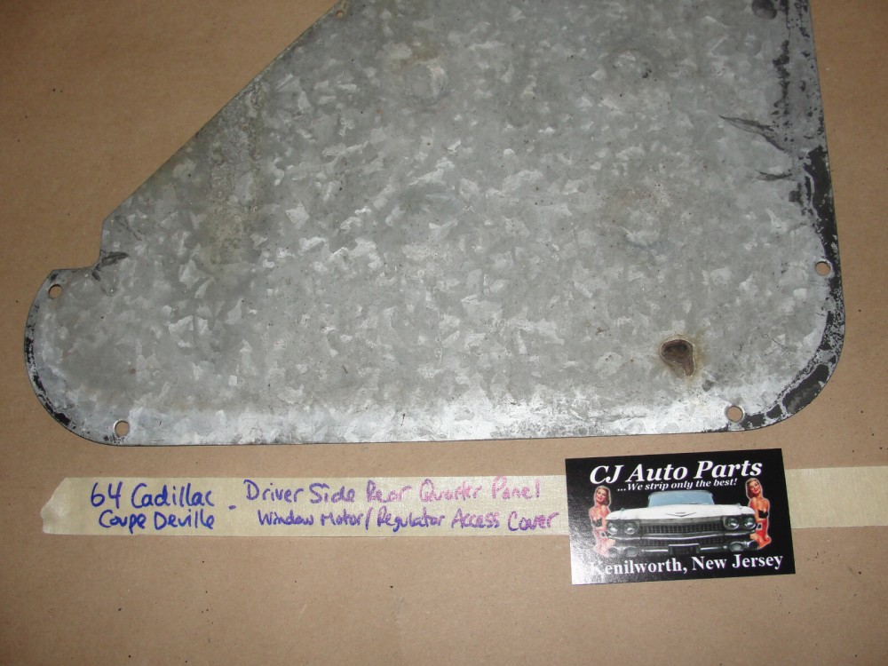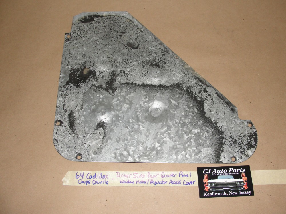 This OEM driver side rear quarter inner panel window regulator access panel is in very good condition. All mounting holes are intact and no rust. This is the removable access plate to allow access to the rear quarter window motor/regulator. Please look at all pictures & compare to yours, as the pictures are part of the description. This was removed from a 1964 Cadillac Coupe Deville, but may fit other vehicles listed in compatibility chart; please do your own research as we do not offer refunds if it does not fit your vehicle.