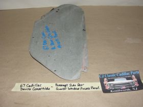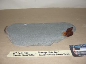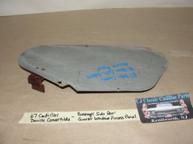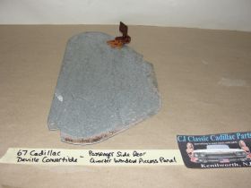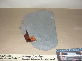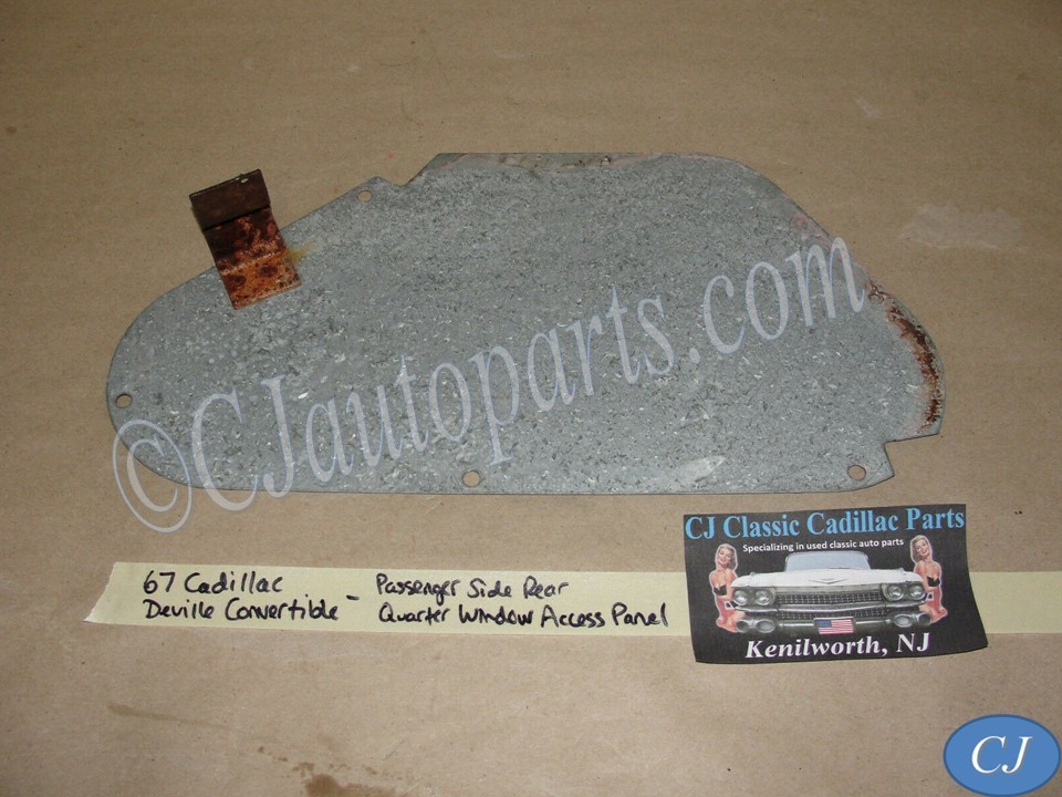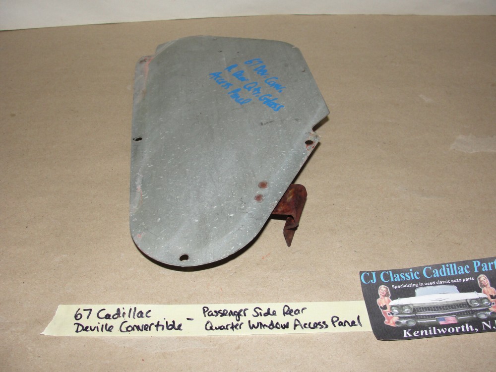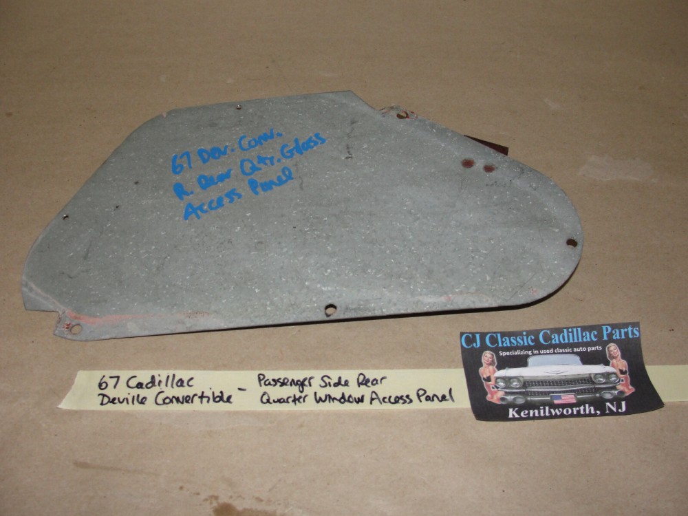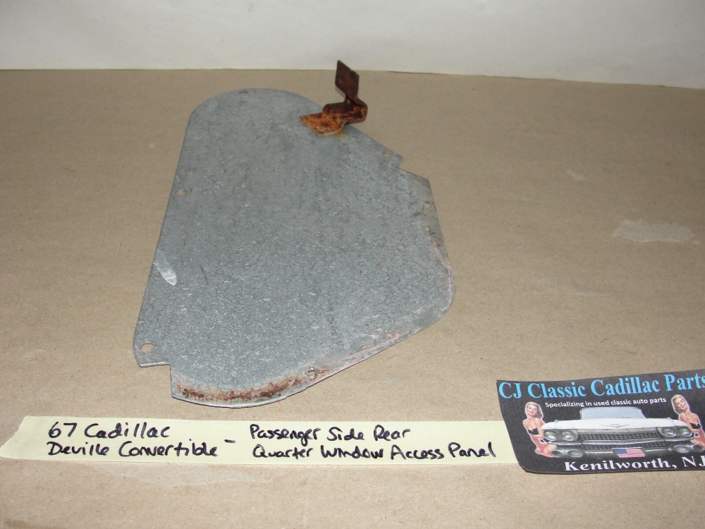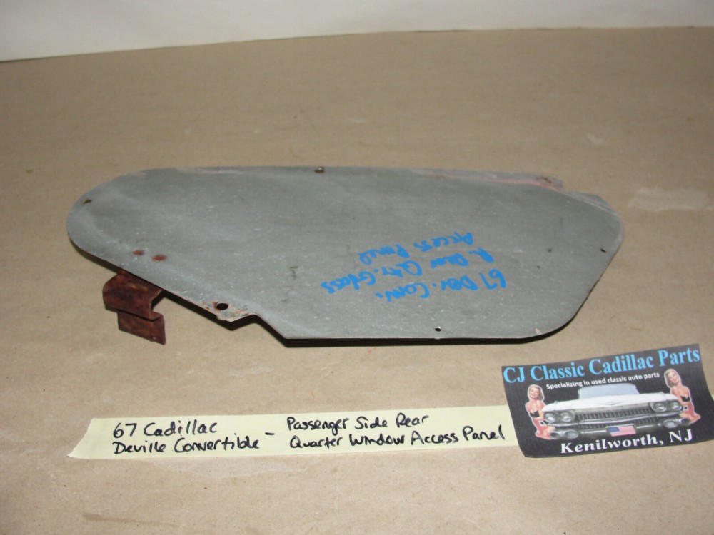 This OEM passenger side rear quarter window glass access panel is in good condition. This mounts to the interior rear quarter section under the trim panel and in removed to allow access to work on the quarter window/regulator. Has average wear typical of a used part its age. Please look at all pictures & compare to yours, as the pictures are part of the description. This was removed from a 1967 Cadillac Deville Convertible, but may fit other vehicles listed in compatibility chart; please do your own research as we do not offer refunds if it does not fit your vehicle.