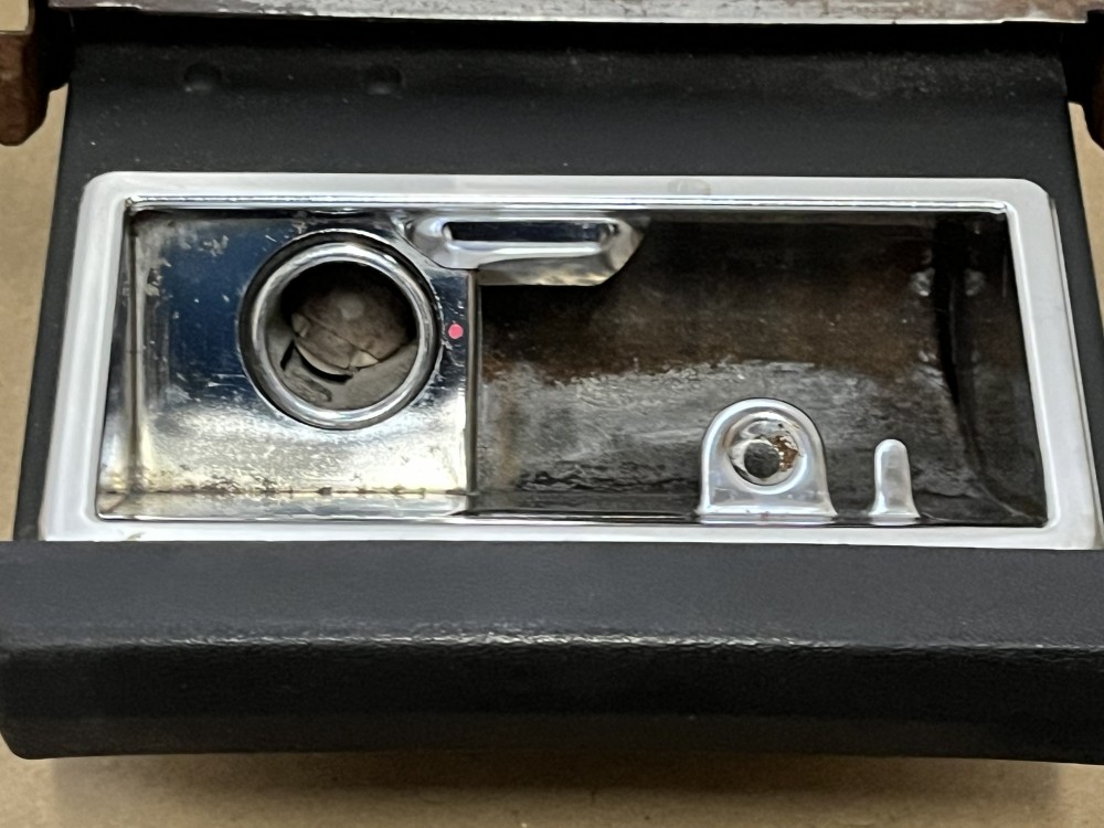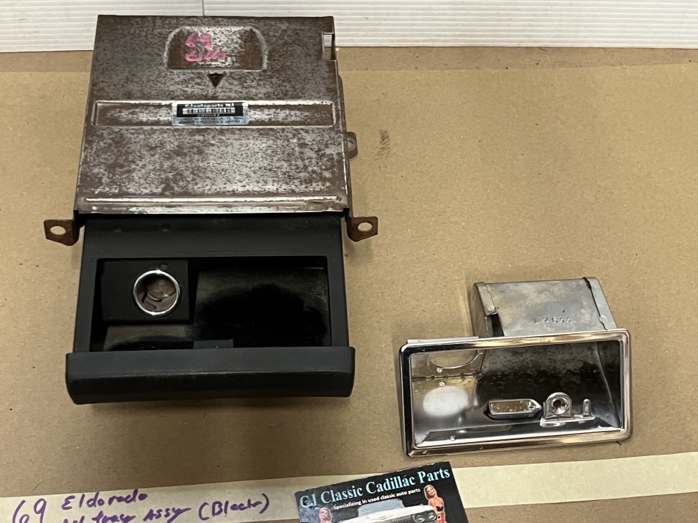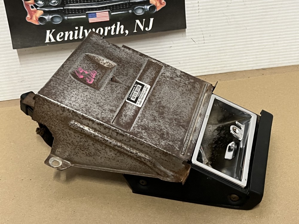 This OEM dash ashtray is in very good condition. Track is lubricated and slides in and out smoothly. Vinyl is intact. Overall fairly clean for its age. Meta frame has surface rust (won;t be seen when installed). The chrome does have a reflective shine but does have surface rust. Cigarette lighter socket is untested. Please look at all pictures as they are part of the description. This was removed from a 1969 Cadillac Eldorado, but may fit other vehicles listed in compatibility chart; fitment verified by Cadillac Master Parts List 12.009, please do your own research as we do not offer refunds if it does not fit your vehicle.