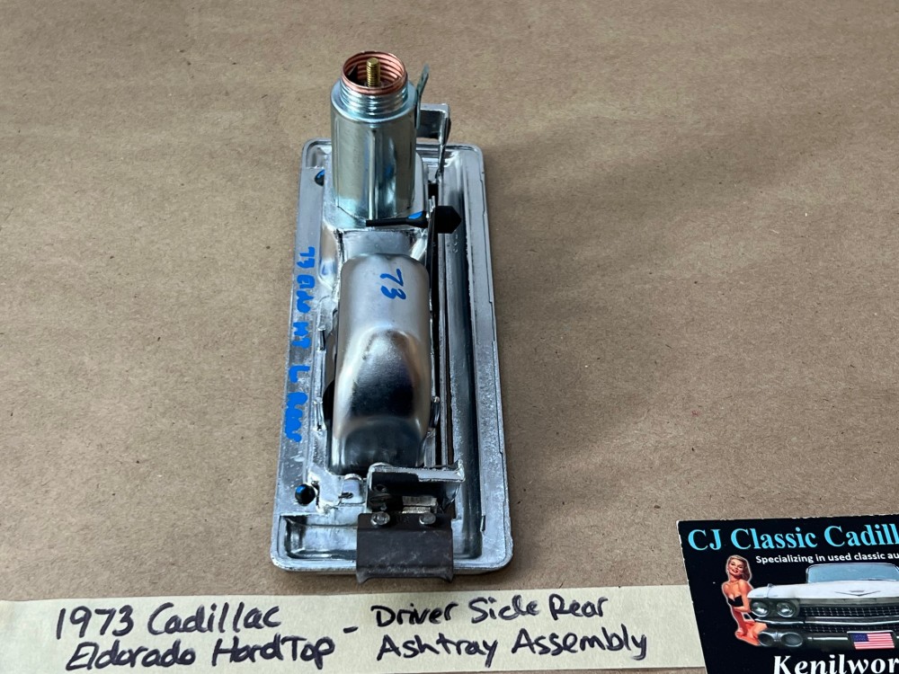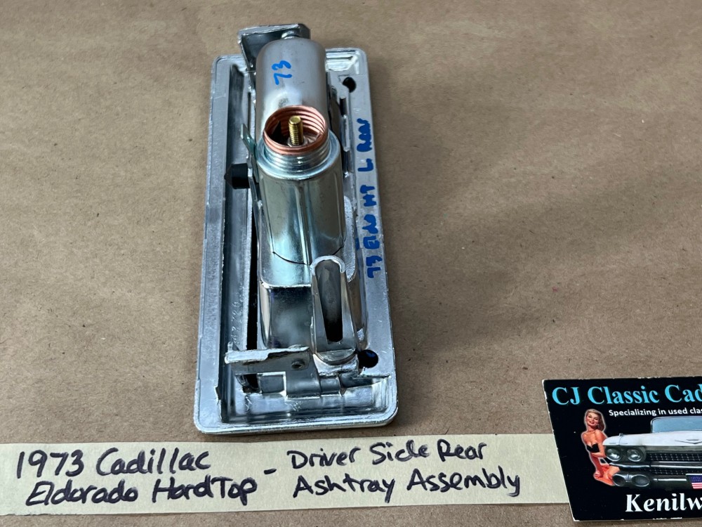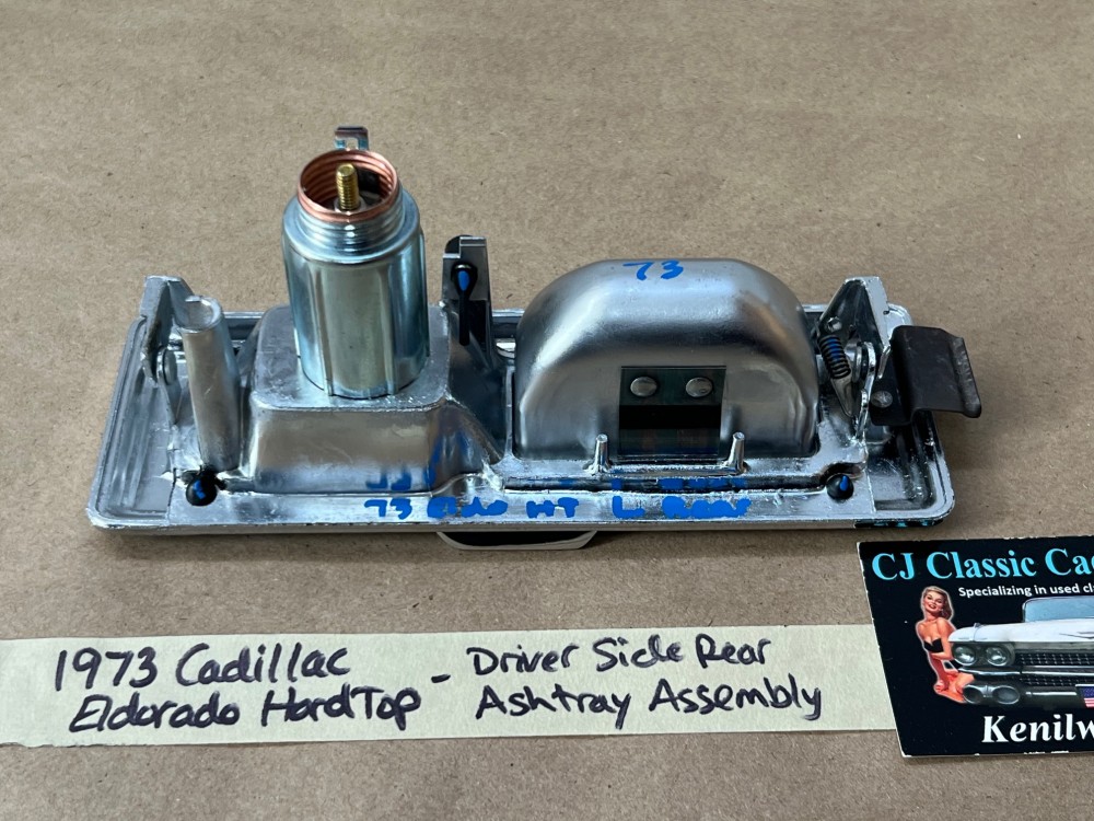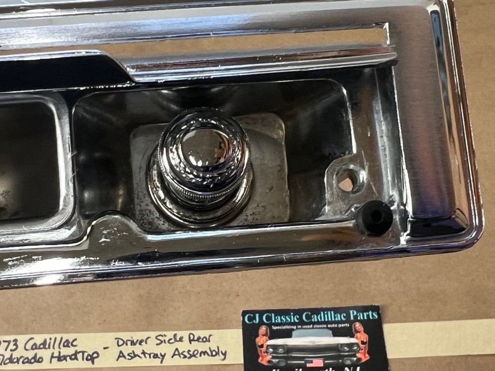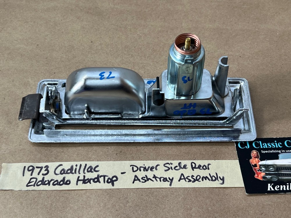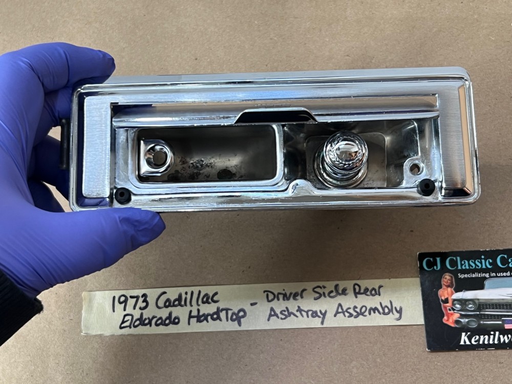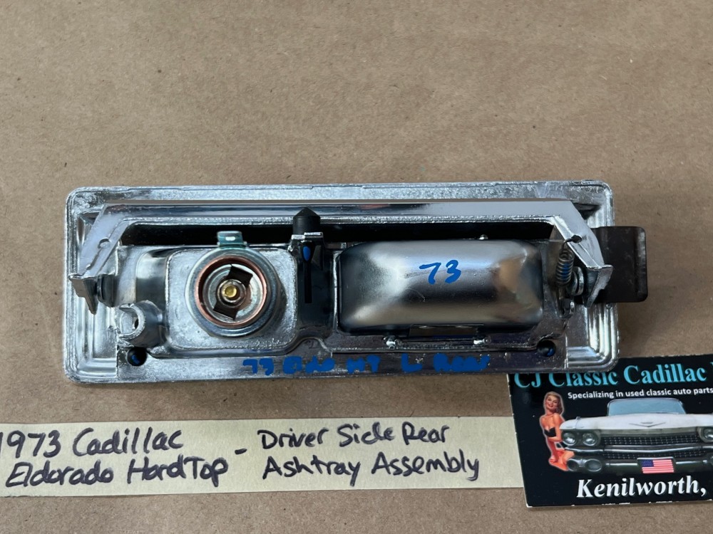 This OEM left rear driver side door ashtray assembly is in very good condition. THIS IS FOR 2 DOOR HARD TOP ONLY. Chrome has a nice reflective shine, has almost no pitting and very light minimal scratches. Ashtray door opens and closes as it should and spring tension is good. Inside of ashtray has some very light surface rust. Cigarette lighter socket is untested. Chrome on cigarette lighter has a nice reflective shine and appears it was never used, coils are in like new condition. Please view the video (https://youtu.be/8iaPhc4UyA4) and view all pictures as they are a part of the description. This was removed from a 1973 Cadillac Eldorado, but may fit other vehicles listed in compatibility chart; please do your own research as we do not offer refunds if it does not fit your vehicle.