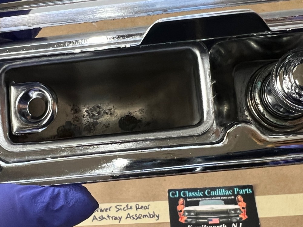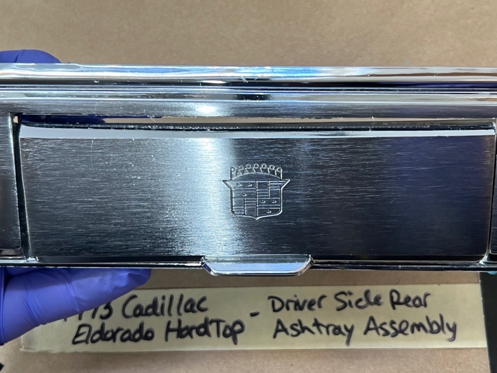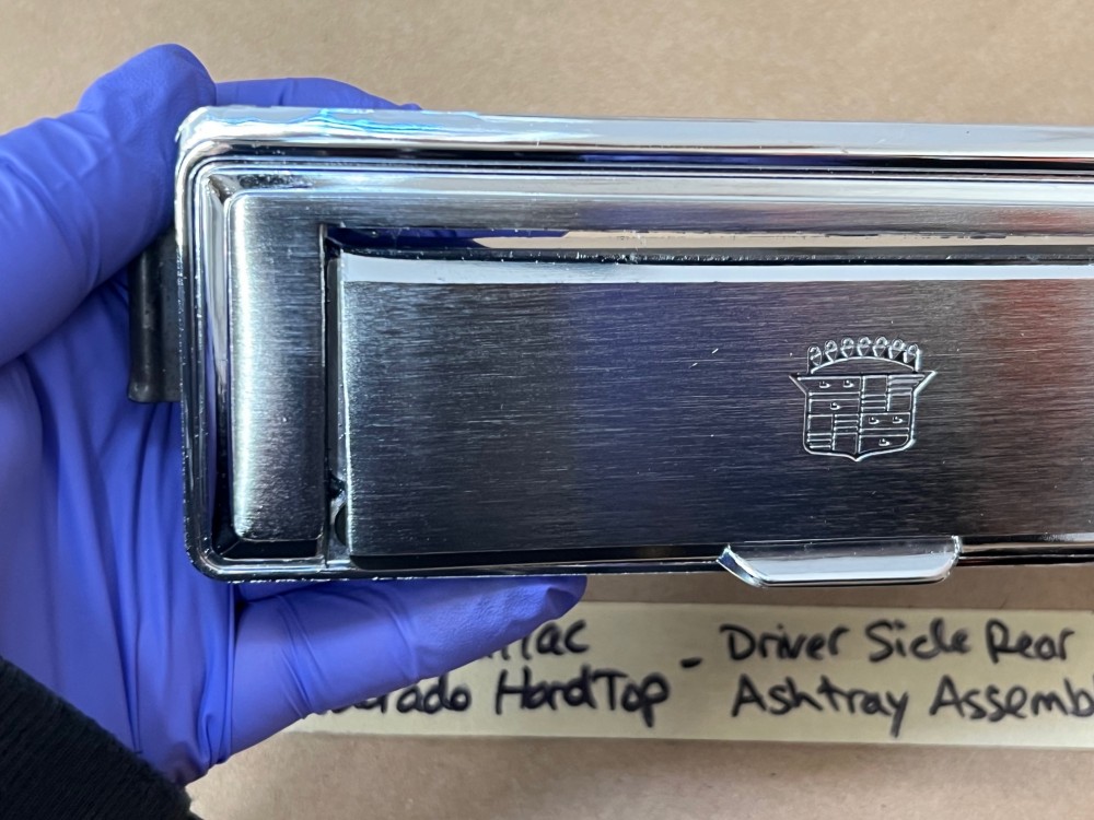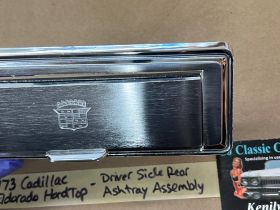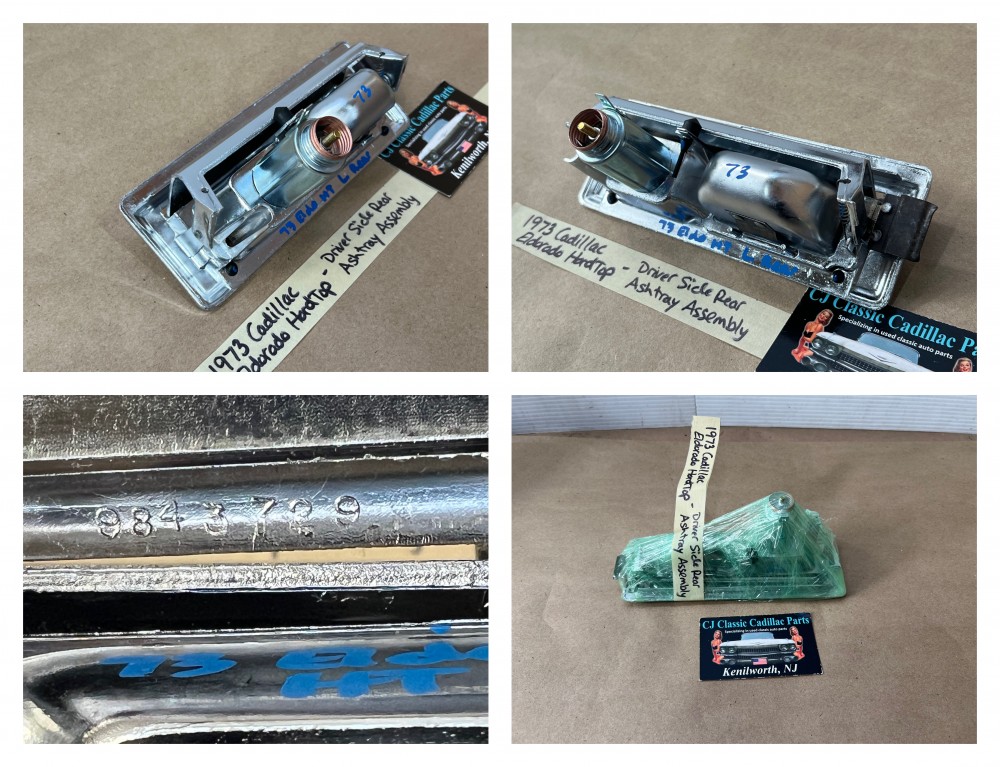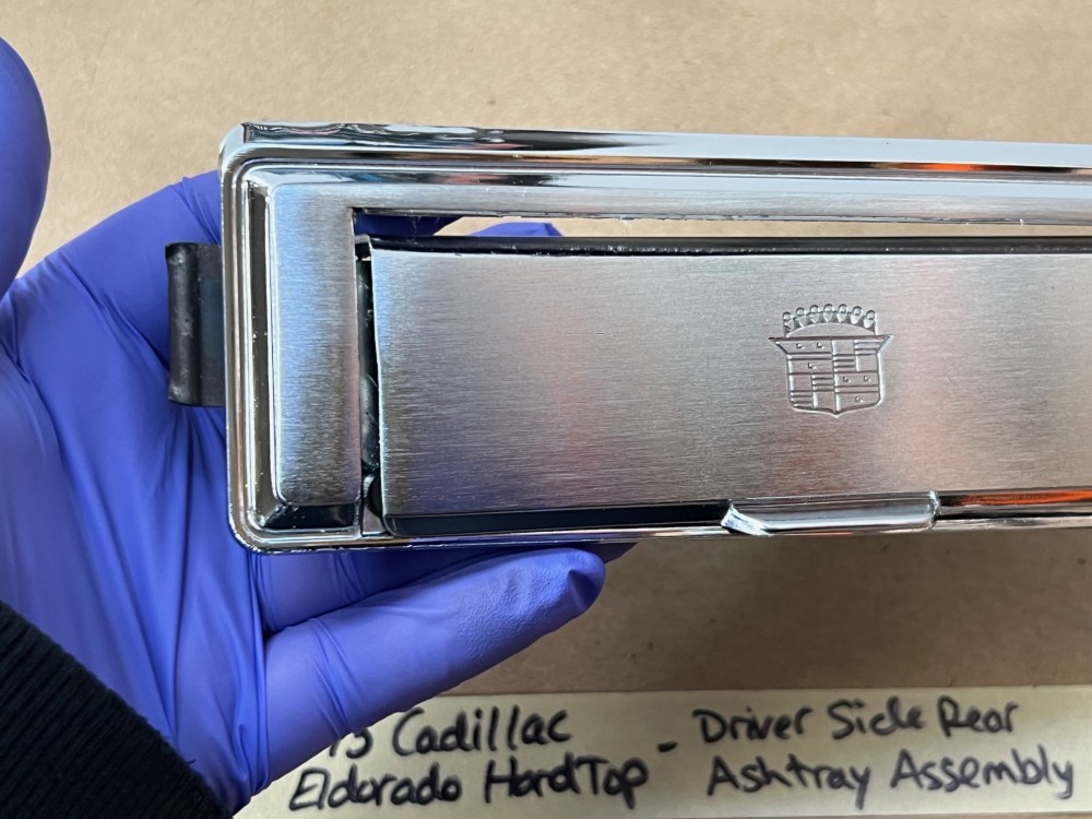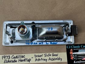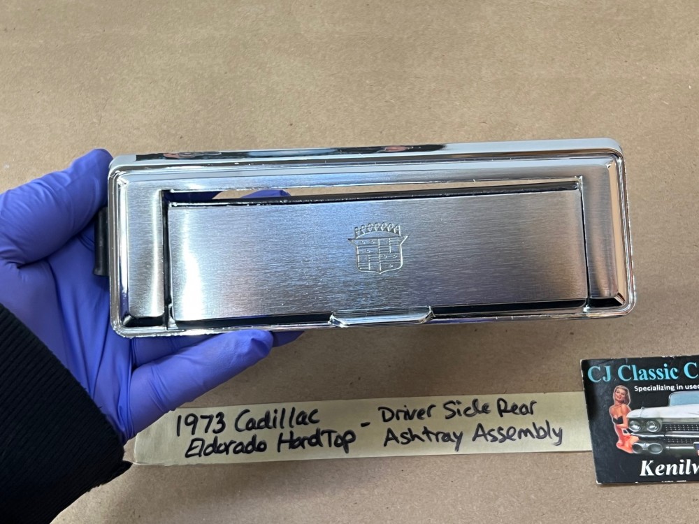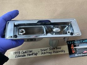 This OEM left rear driver side door ashtray assembly is in very good condition. THIS IS FOR 2 DOOR HARD TOP ONLY. Chrome has a nice reflective shine, has almost no pitting and very light minimal scratches. Ashtray door opens and closes as it should and spring tension is good. Inside of ashtray has some very light surface rust. Cigarette lighter socket is untested. Chrome on cigarette lighter has a nice reflective shine and appears it was never used, coils are in like new condition. Please view the video (https://youtu.be/8iaPhc4UyA4) and view all pictures as they are a part of the description. This was removed from a 1973 Cadillac Eldorado, but may fit other vehicles listed in compatibility chart; please do your own research as we do not offer refunds if it does not fit your vehicle.