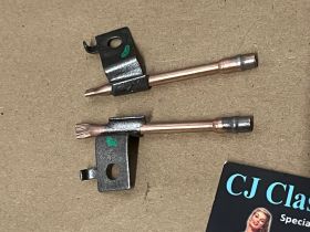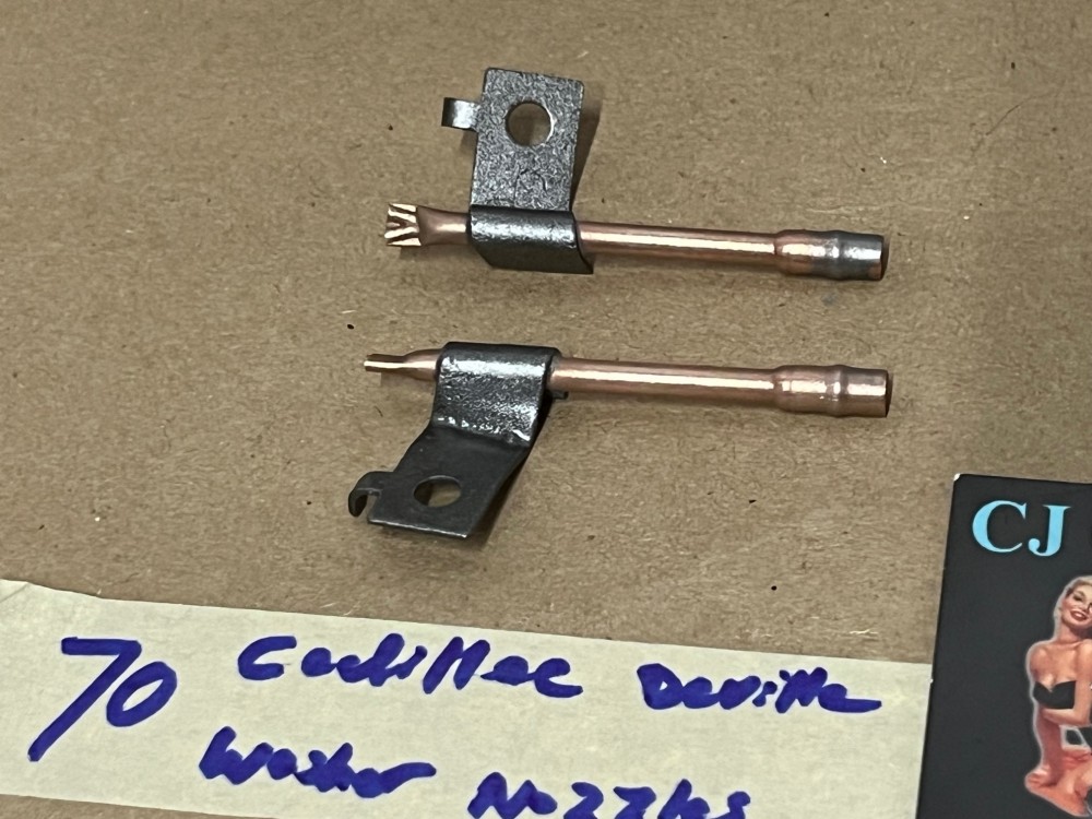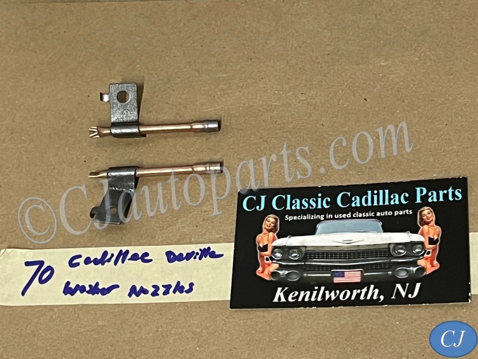 This OEM pair of windshield washer nozzles are in excellent condition. The nozzles are free flowing, not clogged. The copper cleaned up to a nice copper finish. The mounting bracket was cleaned and painted to a nice cast color with a high heat engine paint. This was removed from a 1970 Cadillac Deville, but may fit vehicles listed in compatibility chart; Cadillac fitment is based on Cadillac Master Parts List 10.156, please do your own research as we do not offer refunds if it does not fit your vehicle.