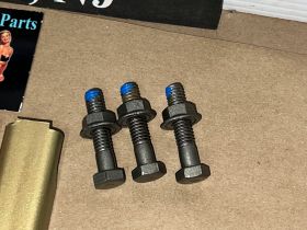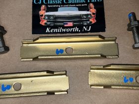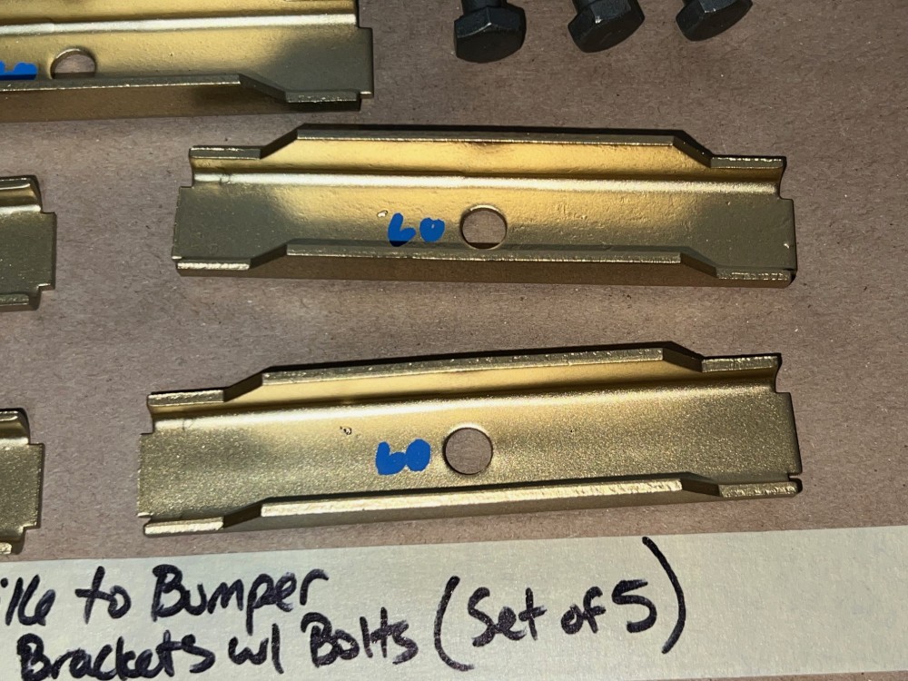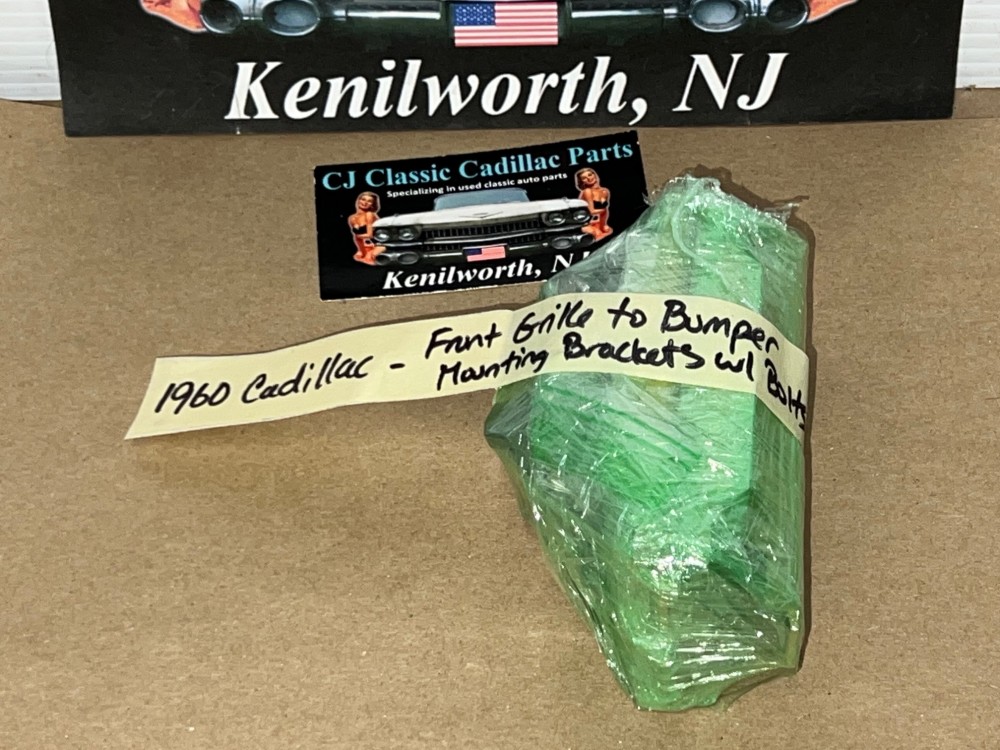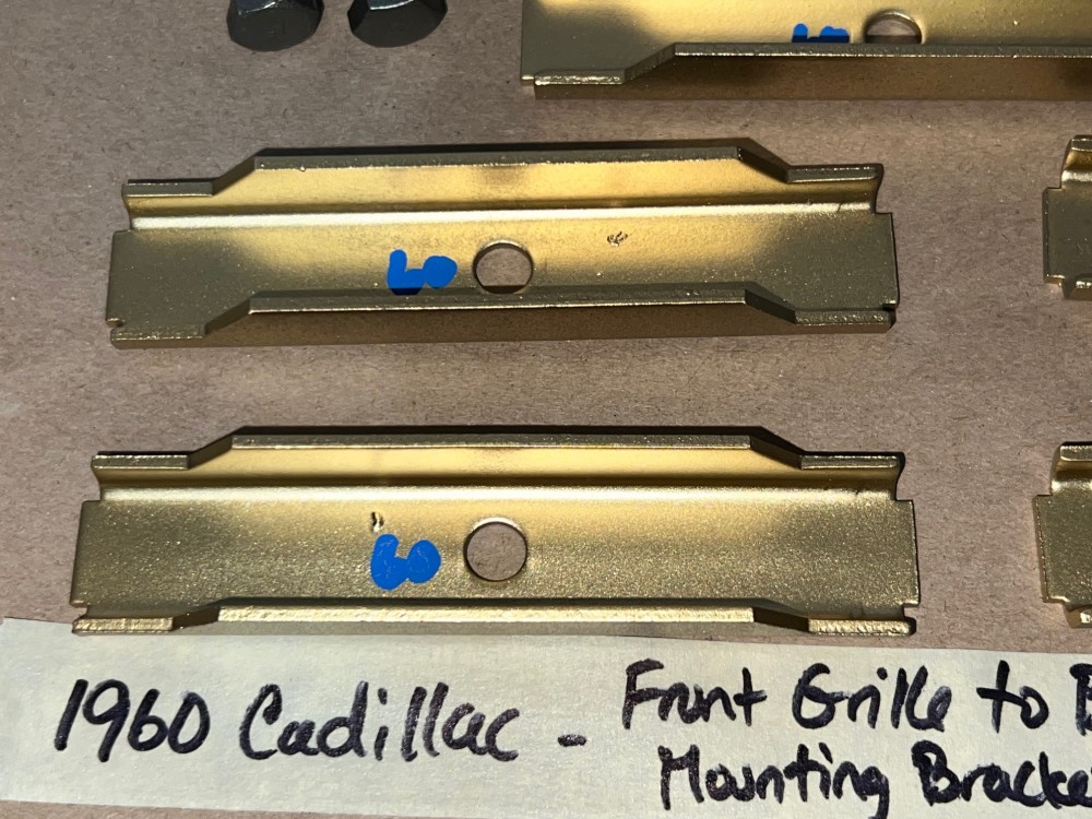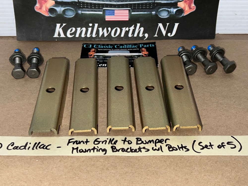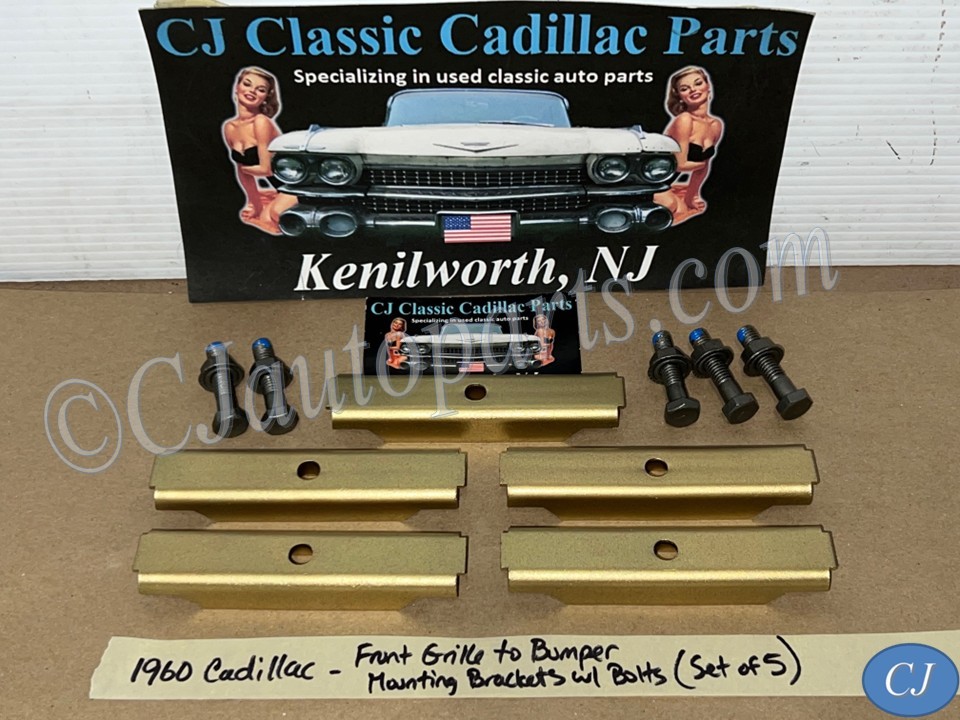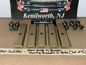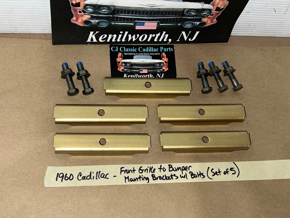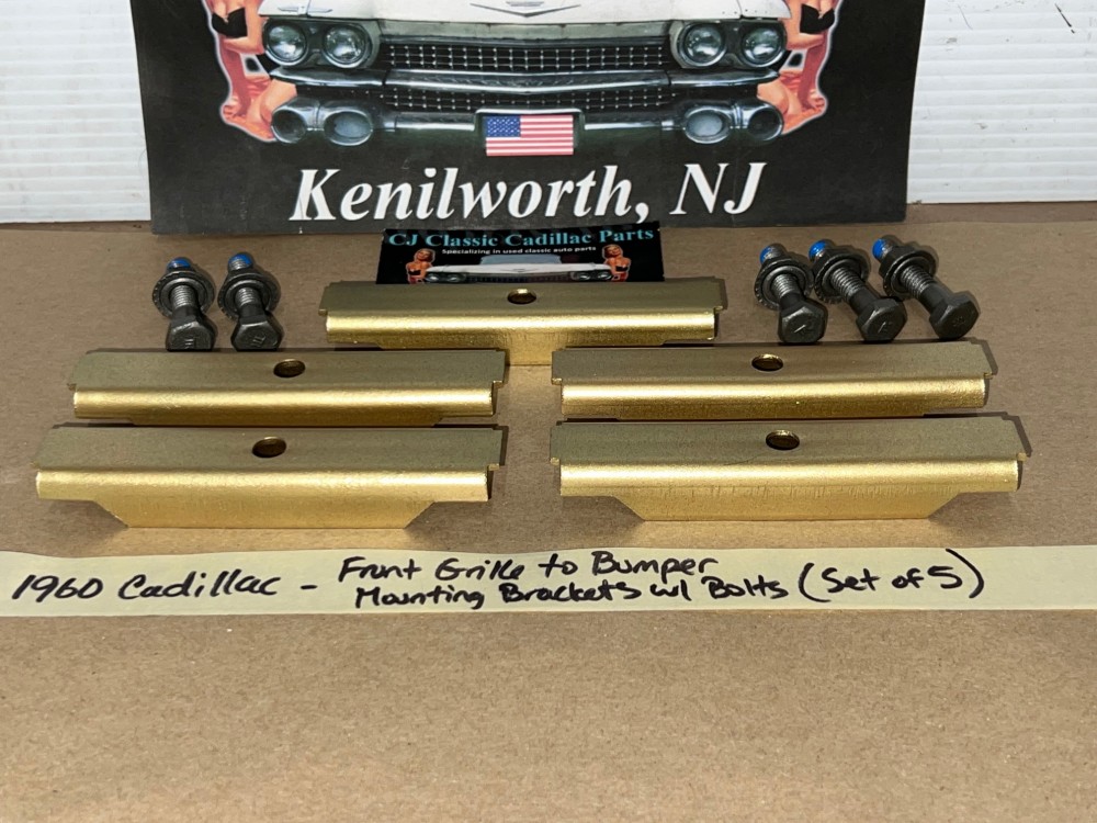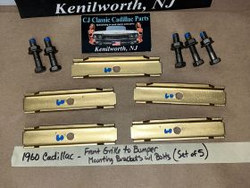 This OEM set of 5 front grill to bumper mounting brackets are in excellent condition. Brackets were sandblasted and painted with a gold cad high heat paint. Brackets are solid, no rot, no heavy pitting. Comes with the factory original "TR" stamped mounting bolts & nuts. Threads on bolts are good, not stripped. Please view all pictures as they are a part of the description. This was removed from a 1960 Cadillac, but may fit other vehicles listed in compatibility chart; please do your own research as we do not offer refunds if it does not fit your vehicle.