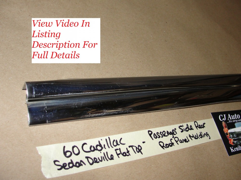 This OEM passenger side rear roof panel molding is in good condition. Chrome has a decent shine, has some average scratches/scuffs/wear typical of a used part its age, but no major dings/dents. Please view the video (https://youtu.be/uDp56L6TPzQ ) and look at all pictures & compare to yours, as the pictures are part of the description. This was removed from a 1960 Cadillac Deville Flat Top, but may fit other vehicles listed in compatibility chart; fitment is verified by Cadillac Master Parts List 35.1210, but please do your own research as we do not offer refunds if it does not fit your vehicle.