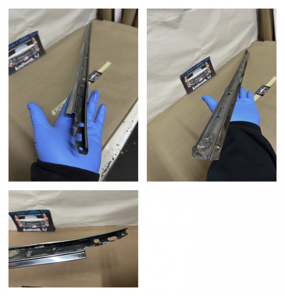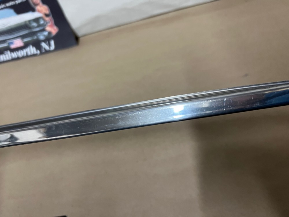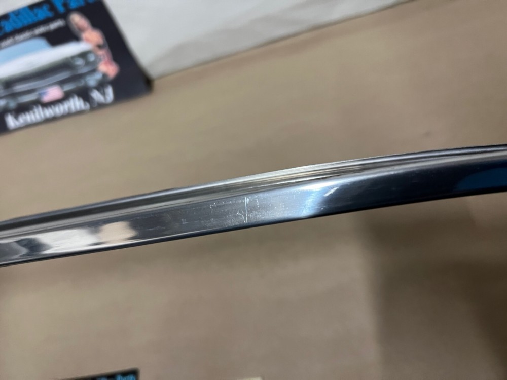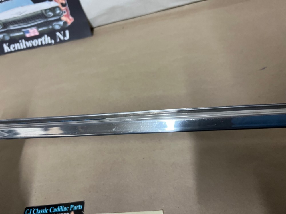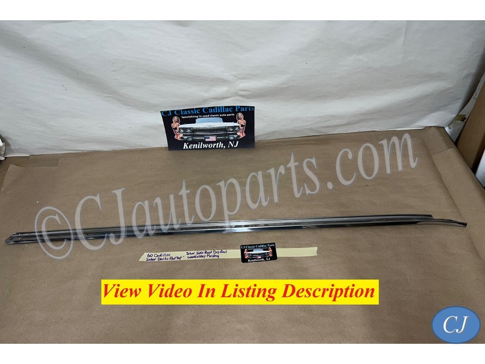 This OEM driver side roof rail weatherstrip retainer molding is in good condition. Chrome has a decent shine, has average light scratches/wear typical of a used part its age. Overall straight, which is hard to find as these moldings are difficult to remove without twisting. Has one minor ding, not very noticeable unless looking for it, otherwise no major dings/dents. Please view the video (https://youtu.be/f0Ne48eKsGQ ) and look at all pictures & compare to yours, as the pictures are part of the description. This was removed from a 1960 Cadillac Sedan Deville Flat Top (4 door, 4 window; body style 6339), but may fit other vehicles listed in compatibility chart; fitment is verified by Cadillac Master Parts List 35.1815 for the drip rail molding (the weatherstrip retainer molding is not listed in the book), but please do your own research as we do not offer refunds if it does not fit your vehicle.