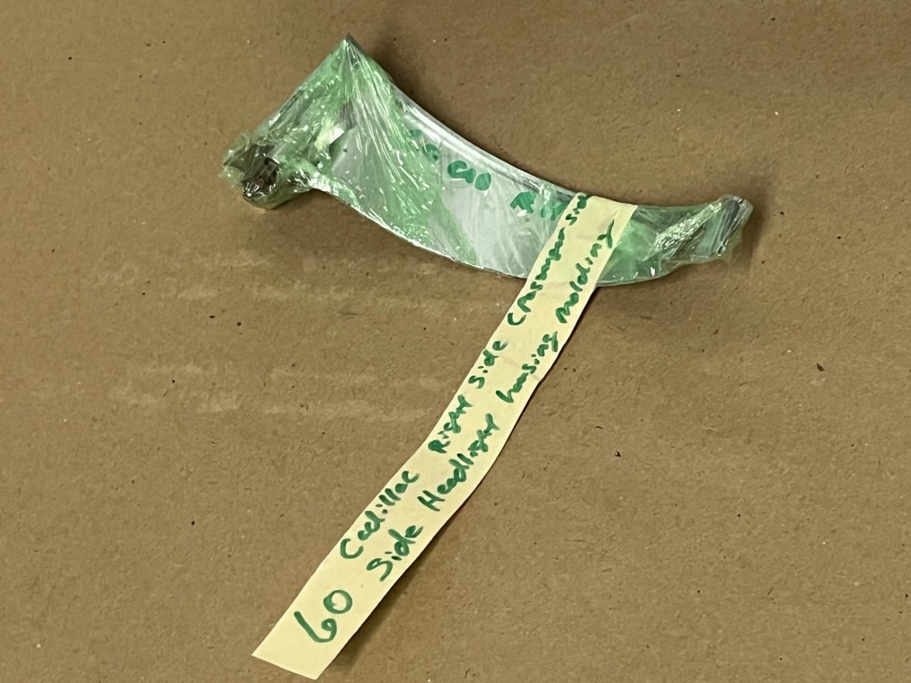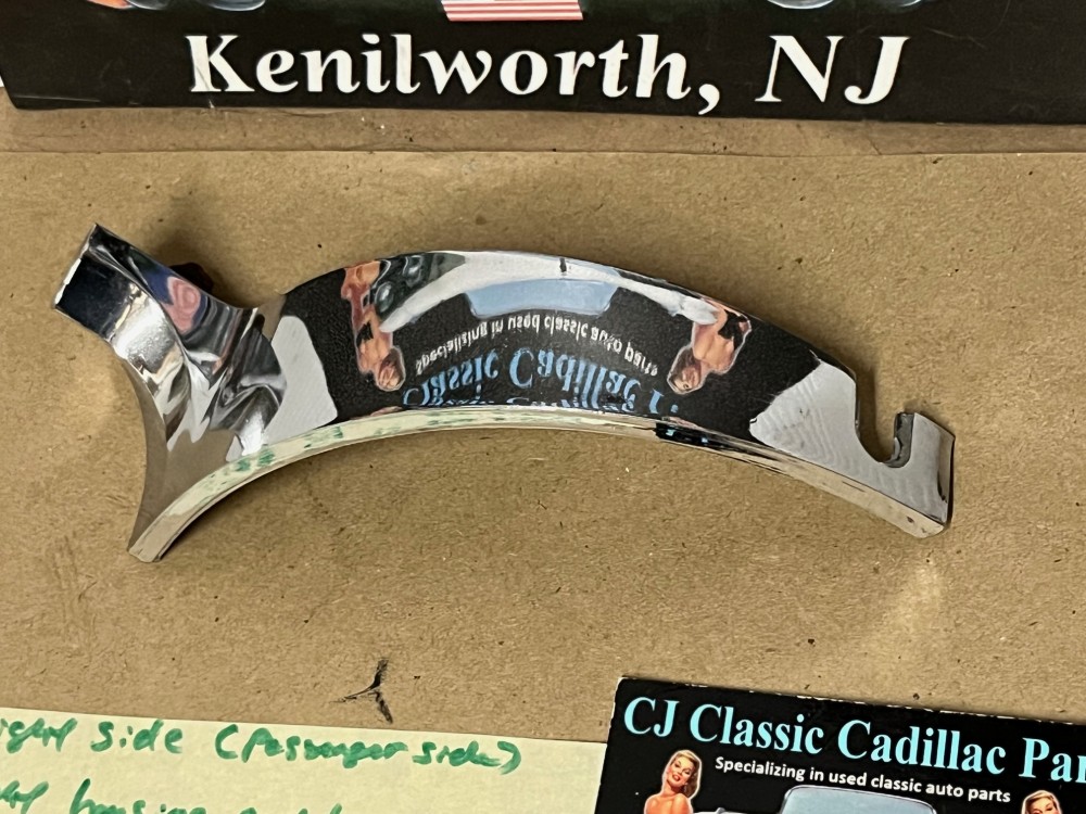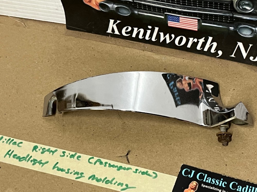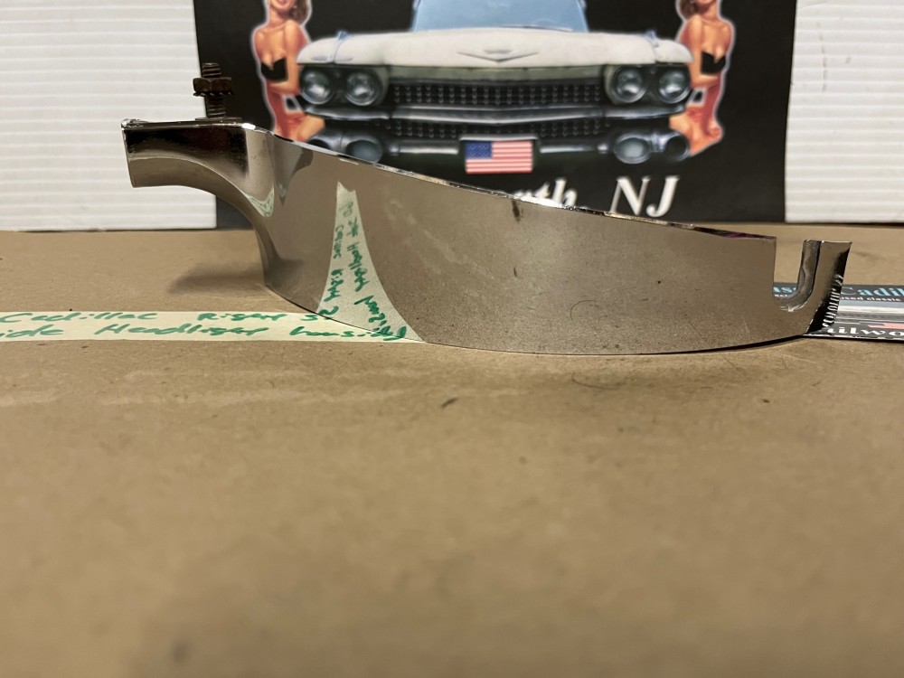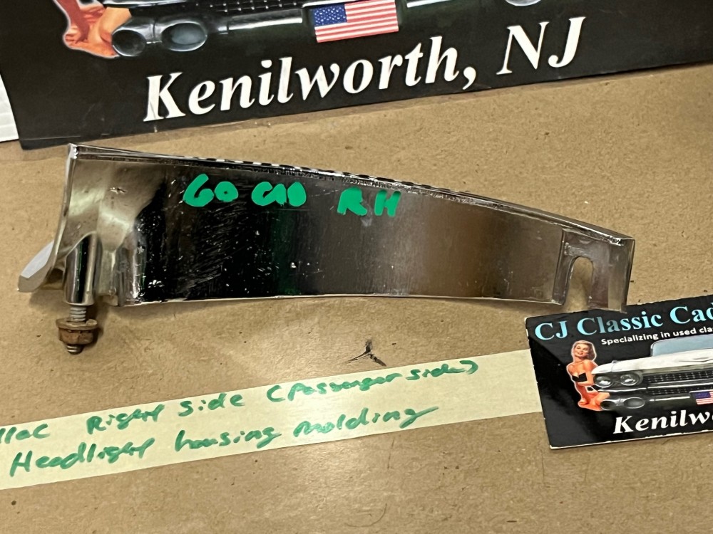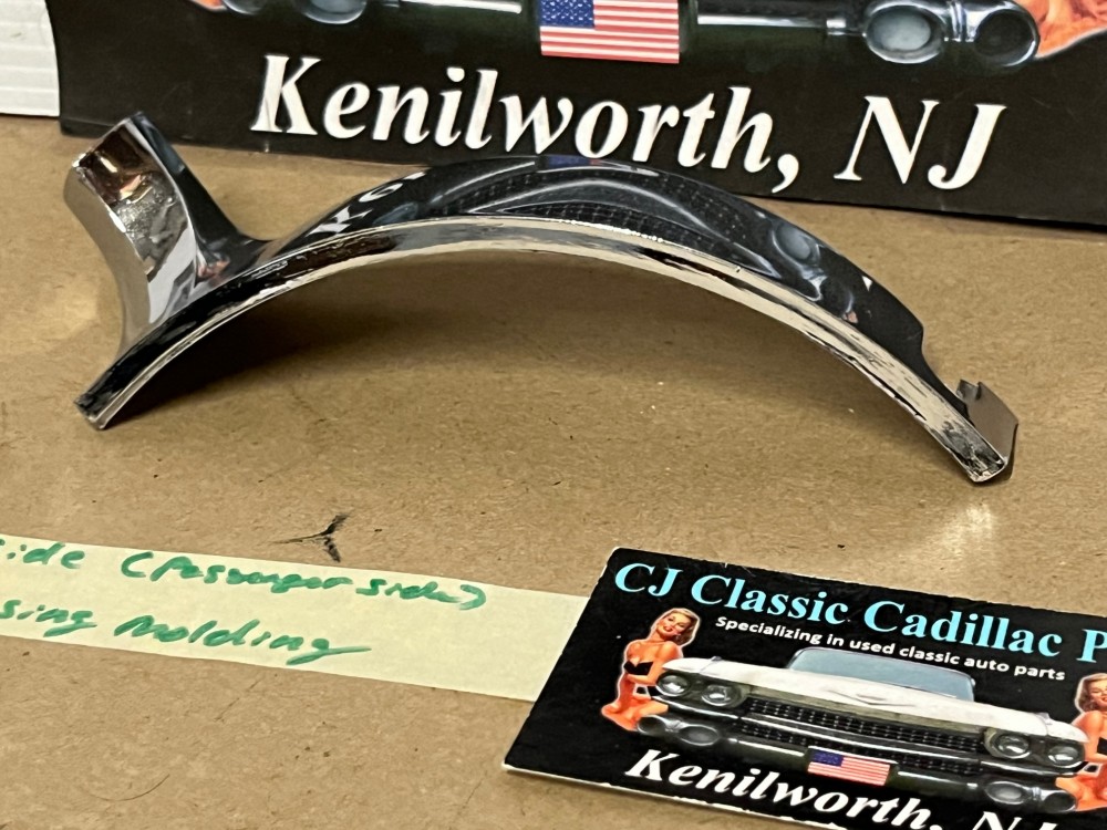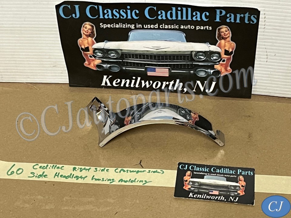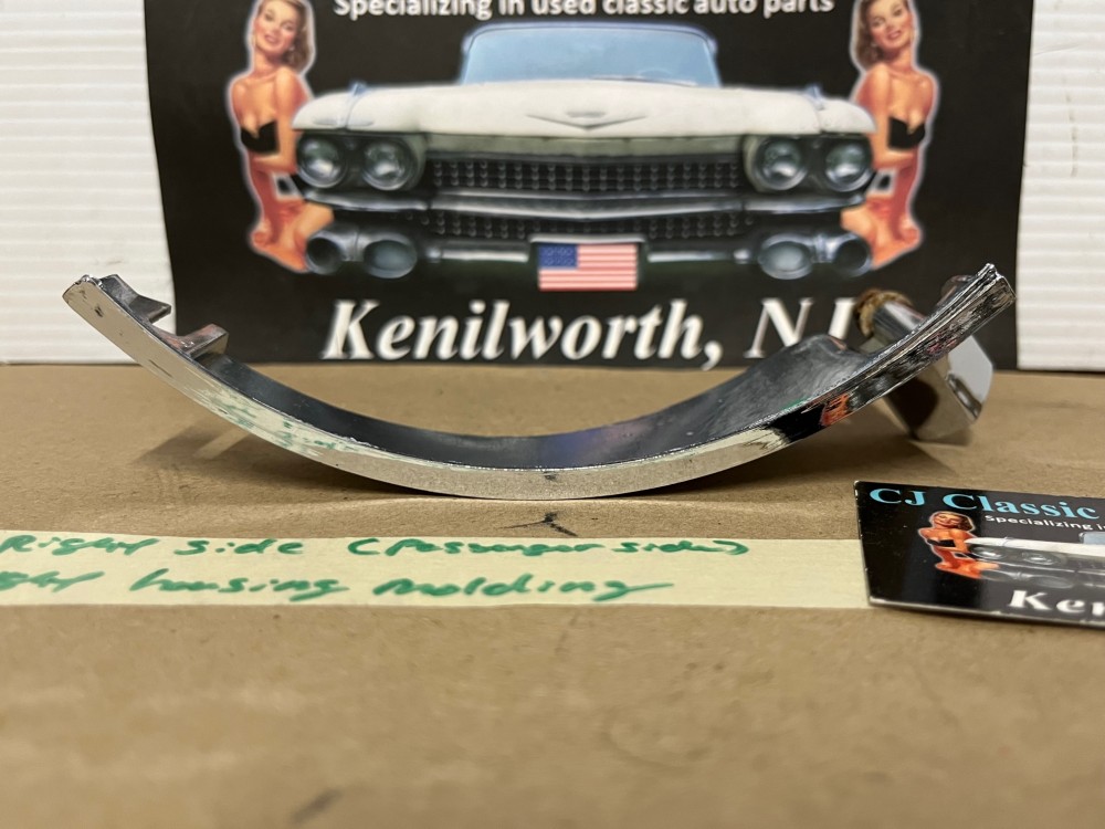 This passenger side OEM headlight bucket molding is in very good condition. Chrome has a good, reflective shine, but does have some minor blemishes typical for its age. Mounting stud is intact. Please see all pictures as they are a part of the description. This was removed from a 1960 Cadillac, but may fit vehicles listed in compatibility chart; fitment is verified by Cadillac Master Parts List 6.1335; please do your own research as we do not offer refunds if it does not fit your vehicle.
