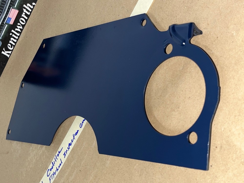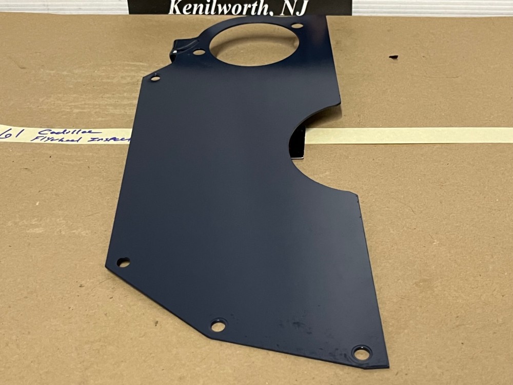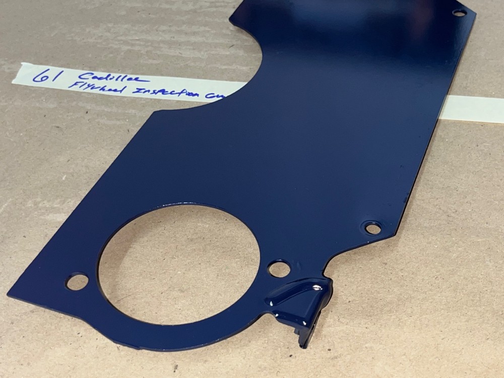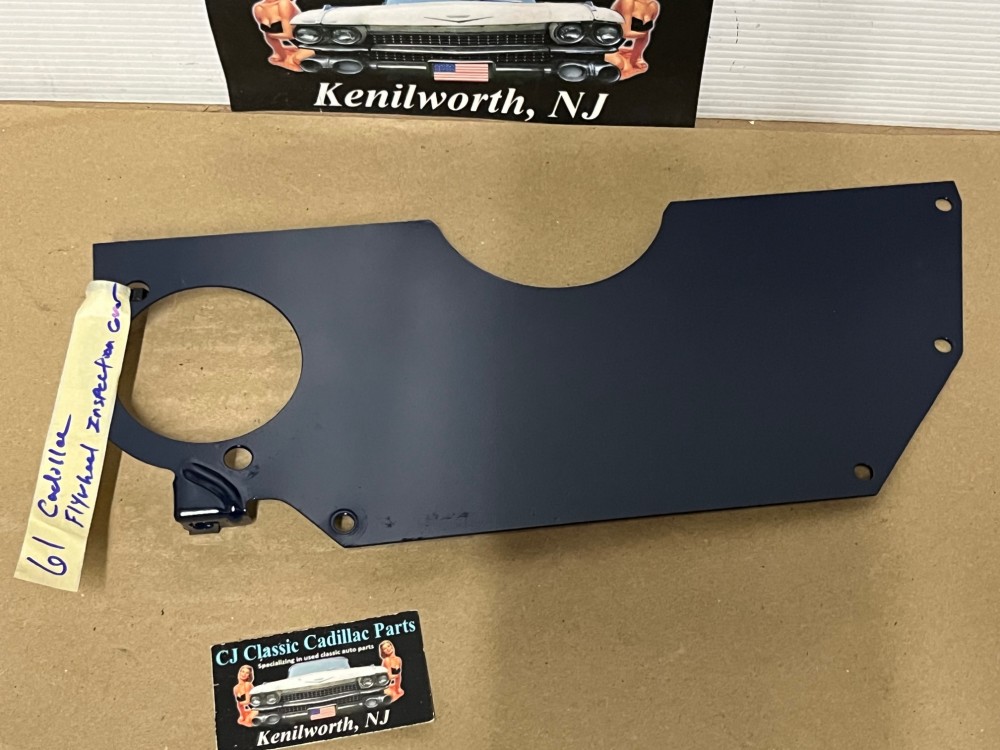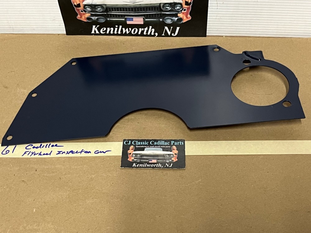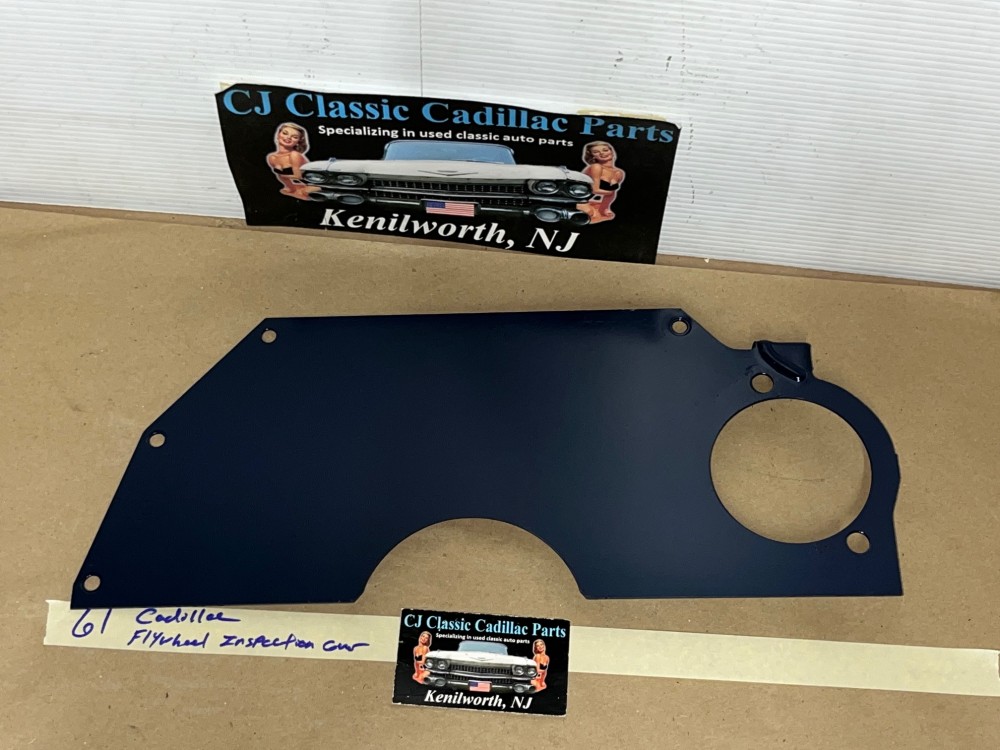 This Restored 390 Engine hydramatic trans flywheel inspection cover is in excellent condition. This was sandblasted and painted with period correct Cadillac Dark Blue engine paint (Bill Hirsch). Cover is fully intact, no cracks.  Has some average light pitting marks.Please view all pictures as they are a part of the description. This was removed from a 1961 Cadillac, but may fit other vehicles listed in compatibility chart below; fitment based on Cadillac Master Parts List 20.0011, #1475097; please do your own research as we do not offer refunds if it does not fit your vehicle.