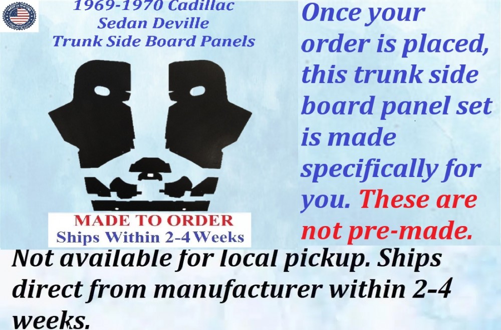 This is a brand new trunk side board panels set that was MADE IN THE USA. This fits the 1969-1970 Cadillac Sedan Deville Hardtop and is perfect for that original look.