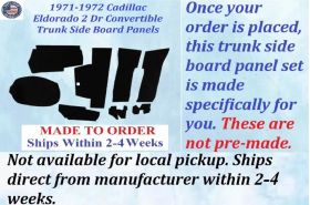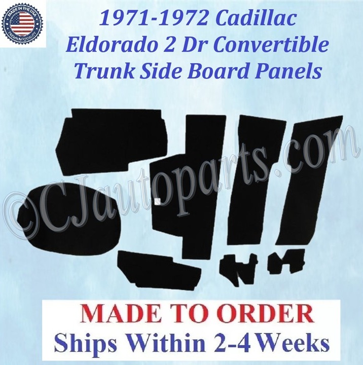 This is a 9 piece brand new trunk side board panels set in black/silver felt that was MADE IN THE USA. This fits the 1971-1972 Cadillac Eldordo Convertible and is perfect for that original look.