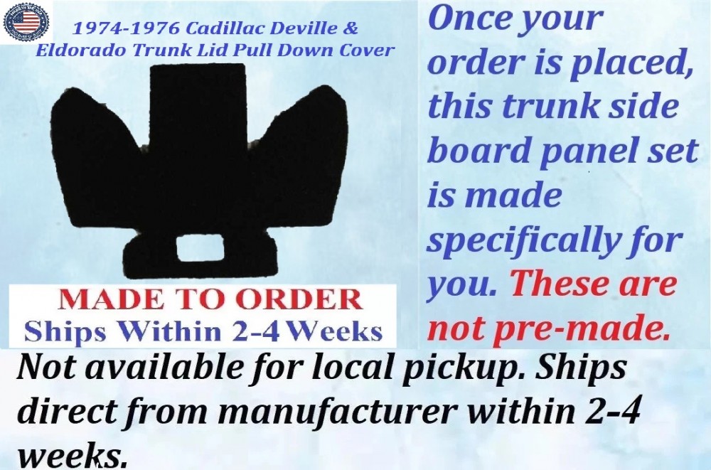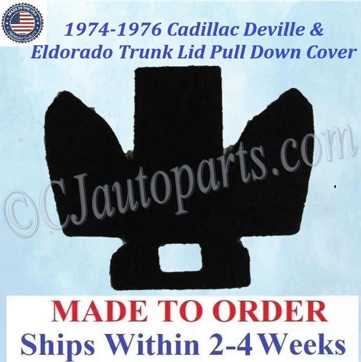 This is a brand new trunk lid pull down cover in black/silver felt that was MADE IN THE USA. This fits the 1974-1976 Cadillac Coupe Deville & Eldorado and is perfect for that original look.