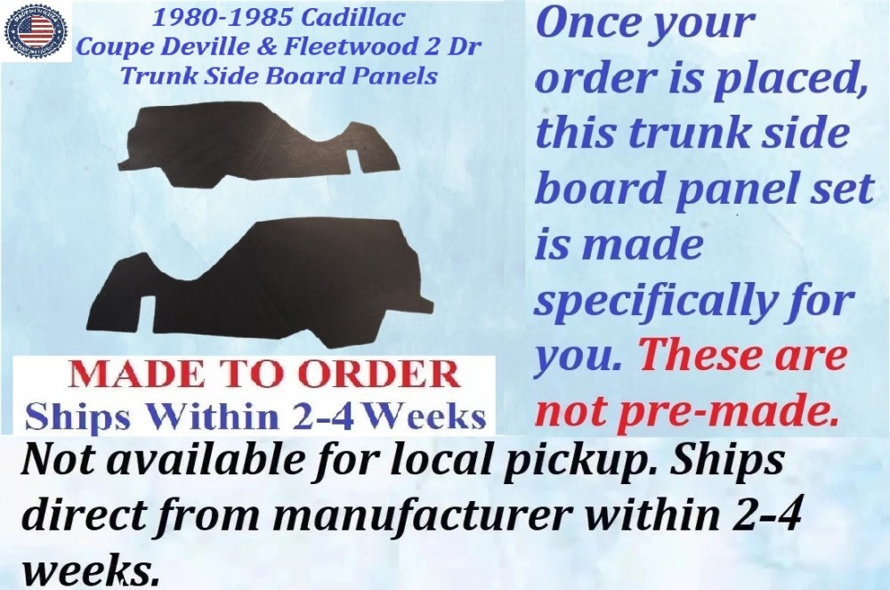 This is a brand new trunk side board panels set that was MADE IN THE USA. This fits the 1980-1985 Cadillac Coupe Deville & Fleetwood 2 Door and is perfect for that original look.
