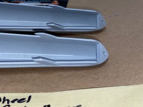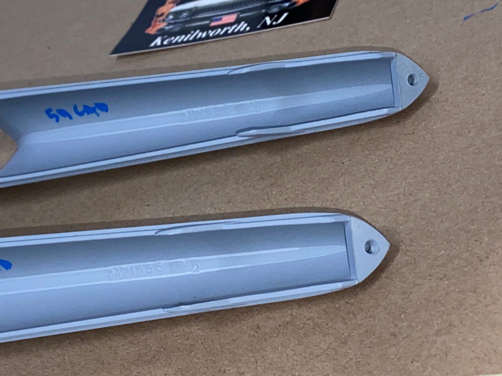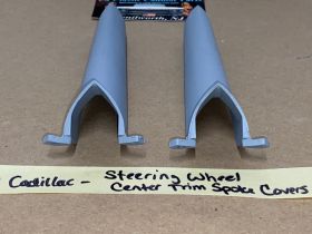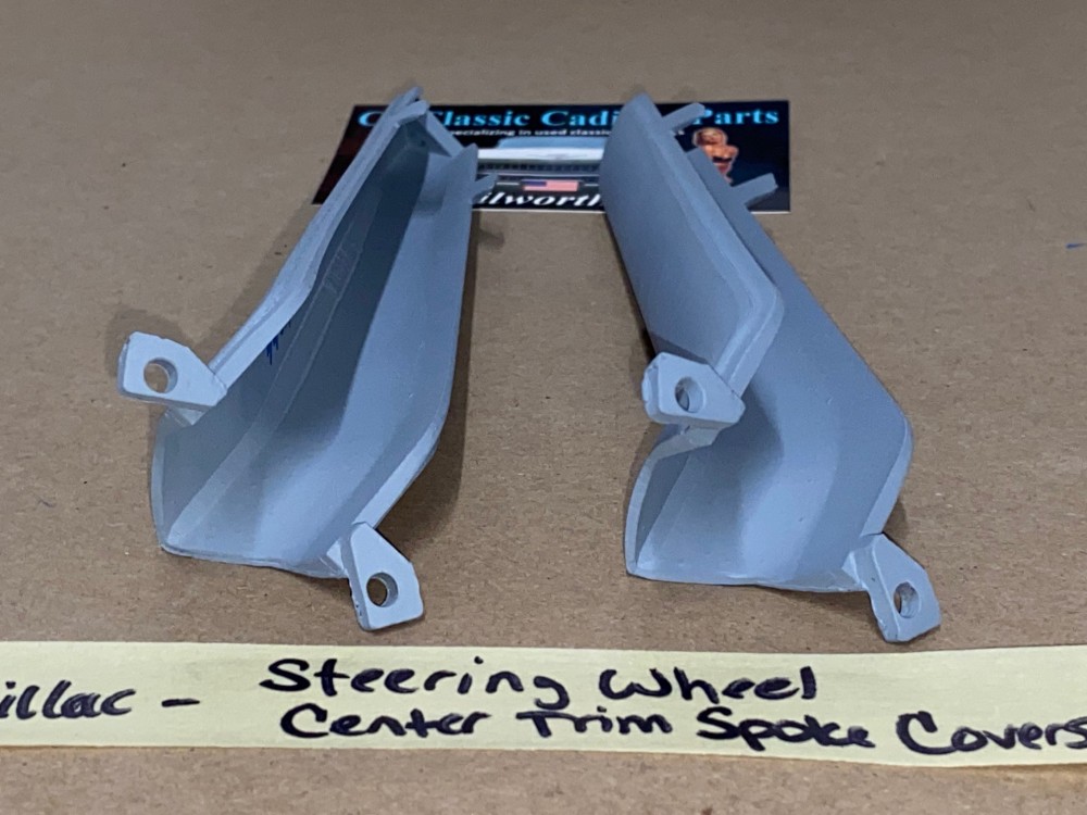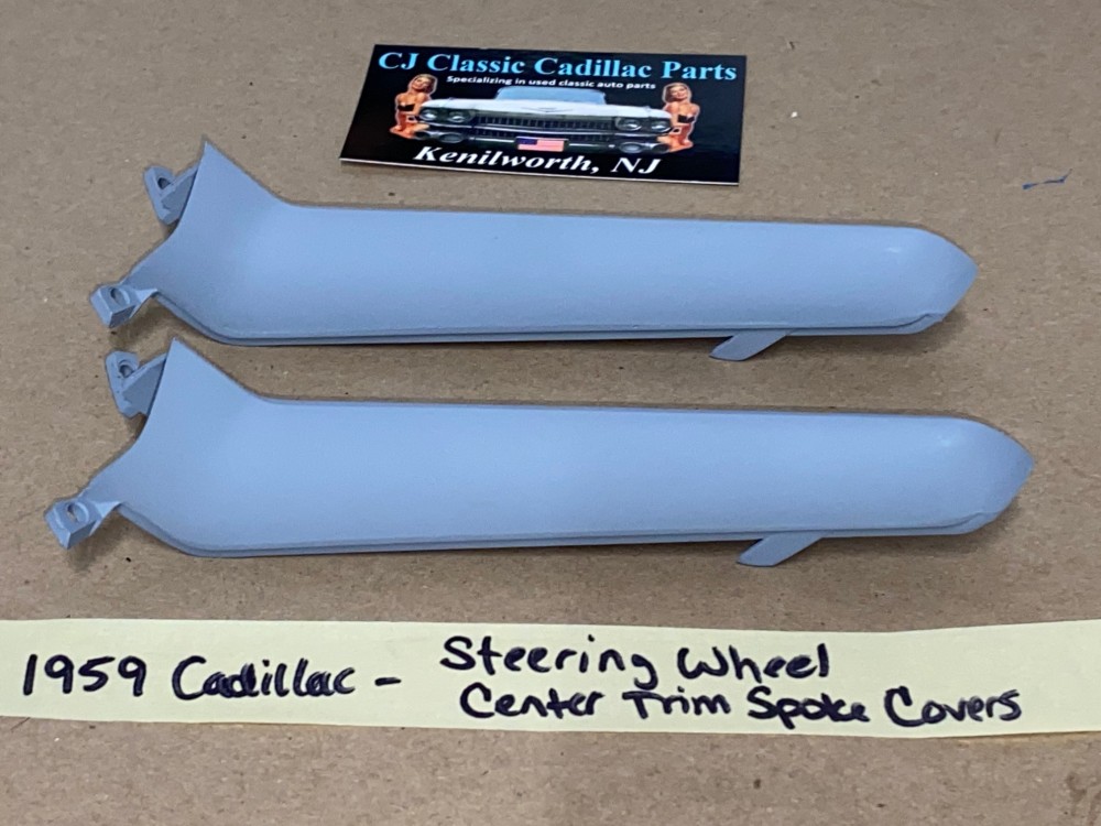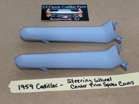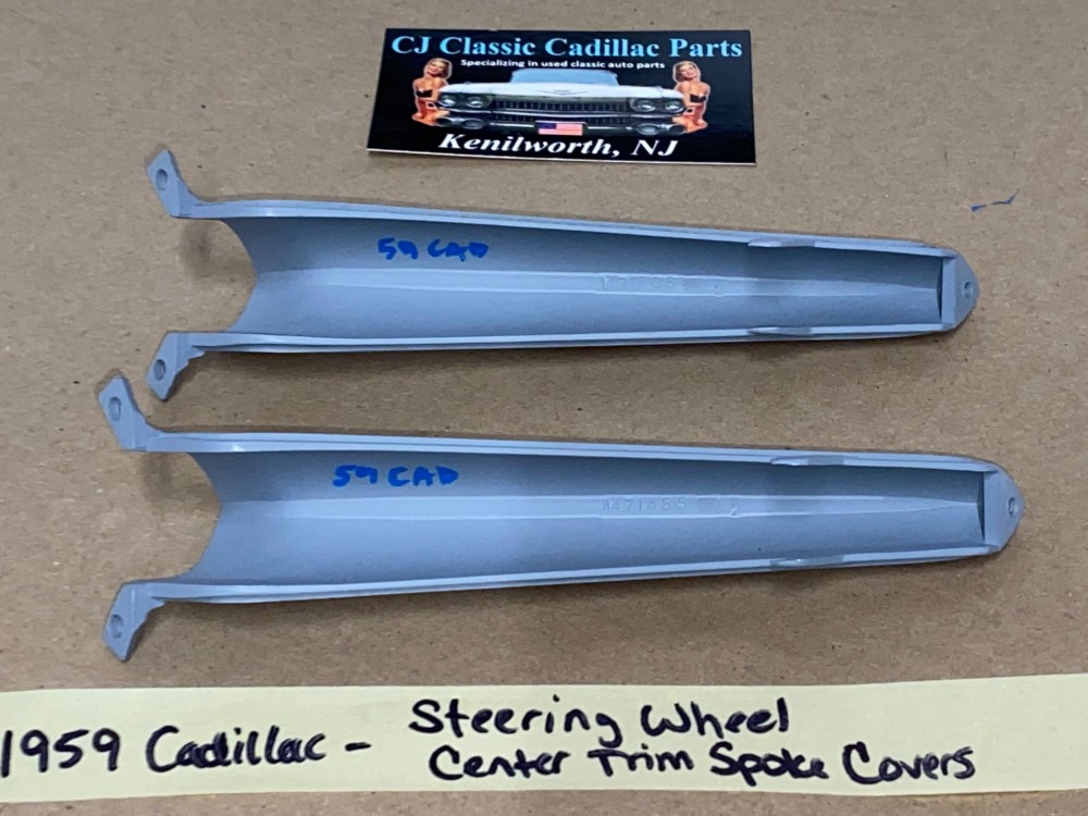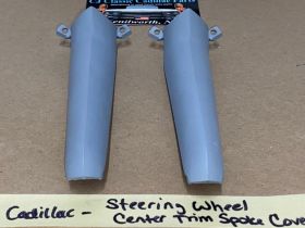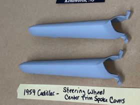 This pair of OEM steering wheel center spoke covers are in excellent condition. This is a very rare find in such good condition, get it while it lasts. These were sandblasted and primed, ready for you to paint to match your steering wheel. All mounting tabs are intact, no cracks. No heavy pitting. Please look at all pics as they are part of the description. This was removed from a 1959 Cadillac, but may fit other vehicles listed in compatibility chart; fitment is based on internet research so please do your own research as we do not offer refunds if it does not fit your vehicle.